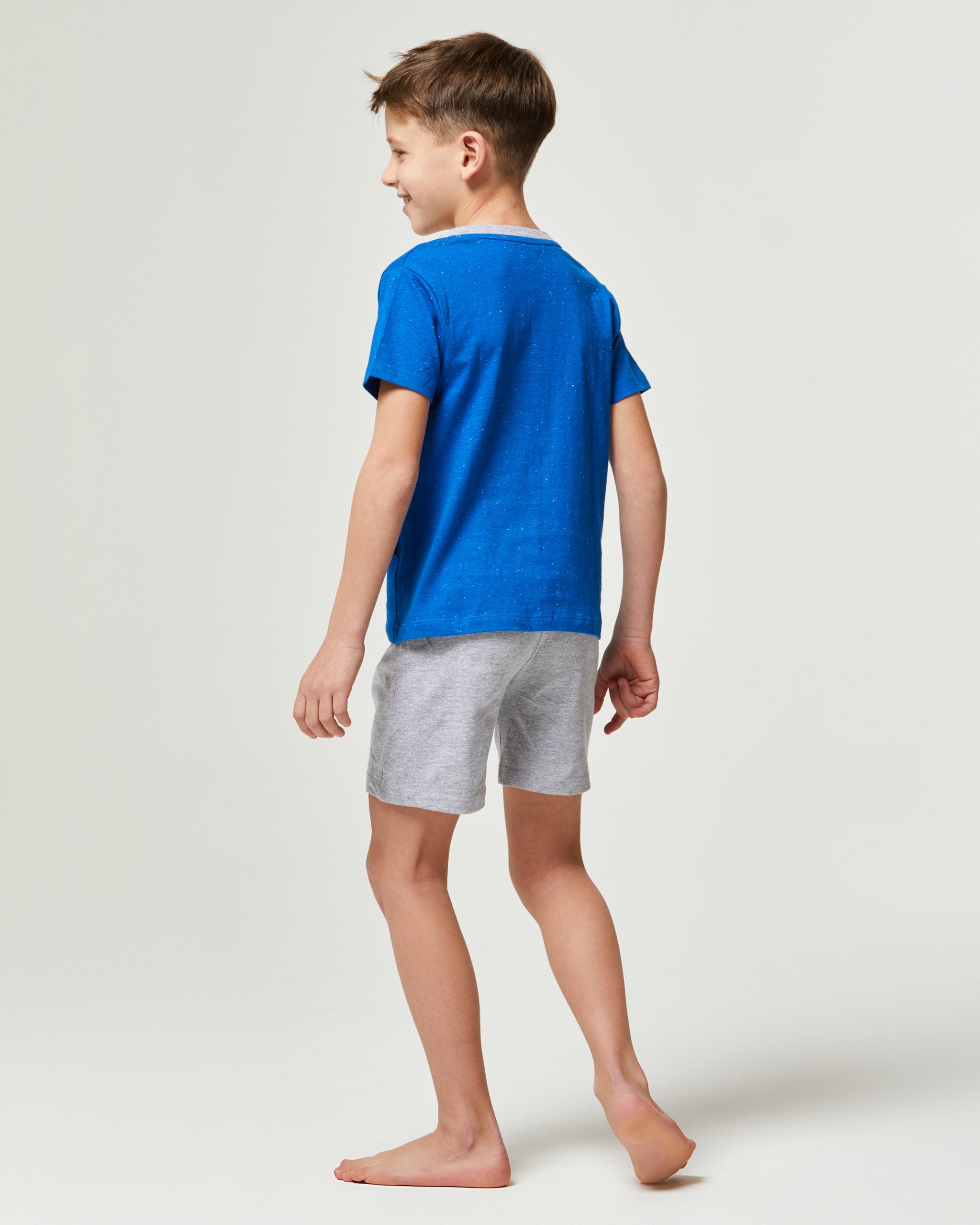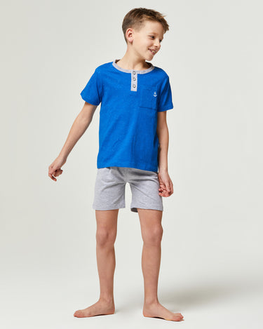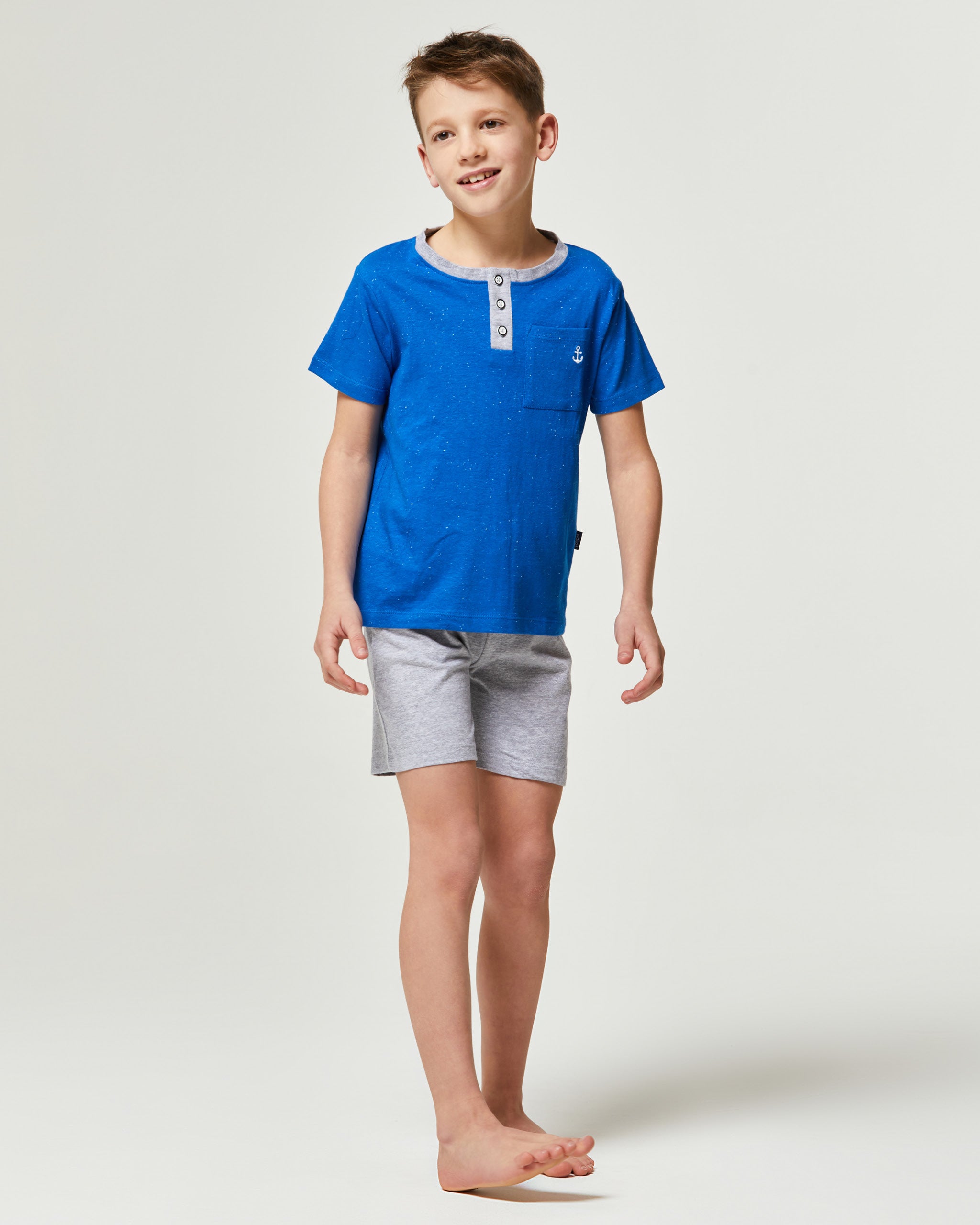 Il pigiama corto Guava presenta una maglia a maniche corte abbinata col suo pantaloncino: La T-Shirt mostra un colletto a contrasto con taschino sul fronte con una piccola ancora ricamata mentre il pantaloncino in tinta unita ha una coulisse in vita per regolare l’aderenza. Non ti resta che guardare il tuo bambino crescere mentre vive le sue avventure indossando il vero comfort Pompea.