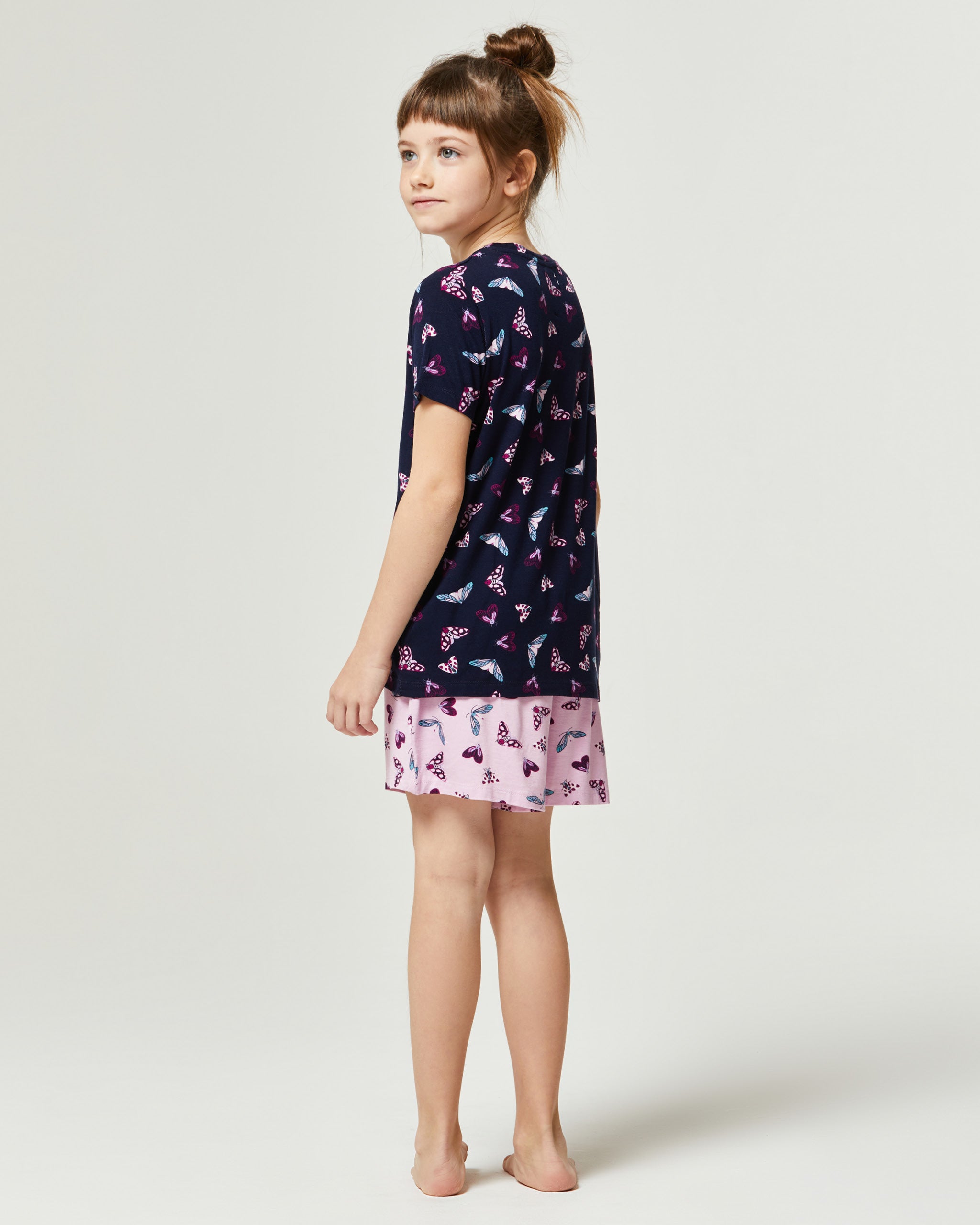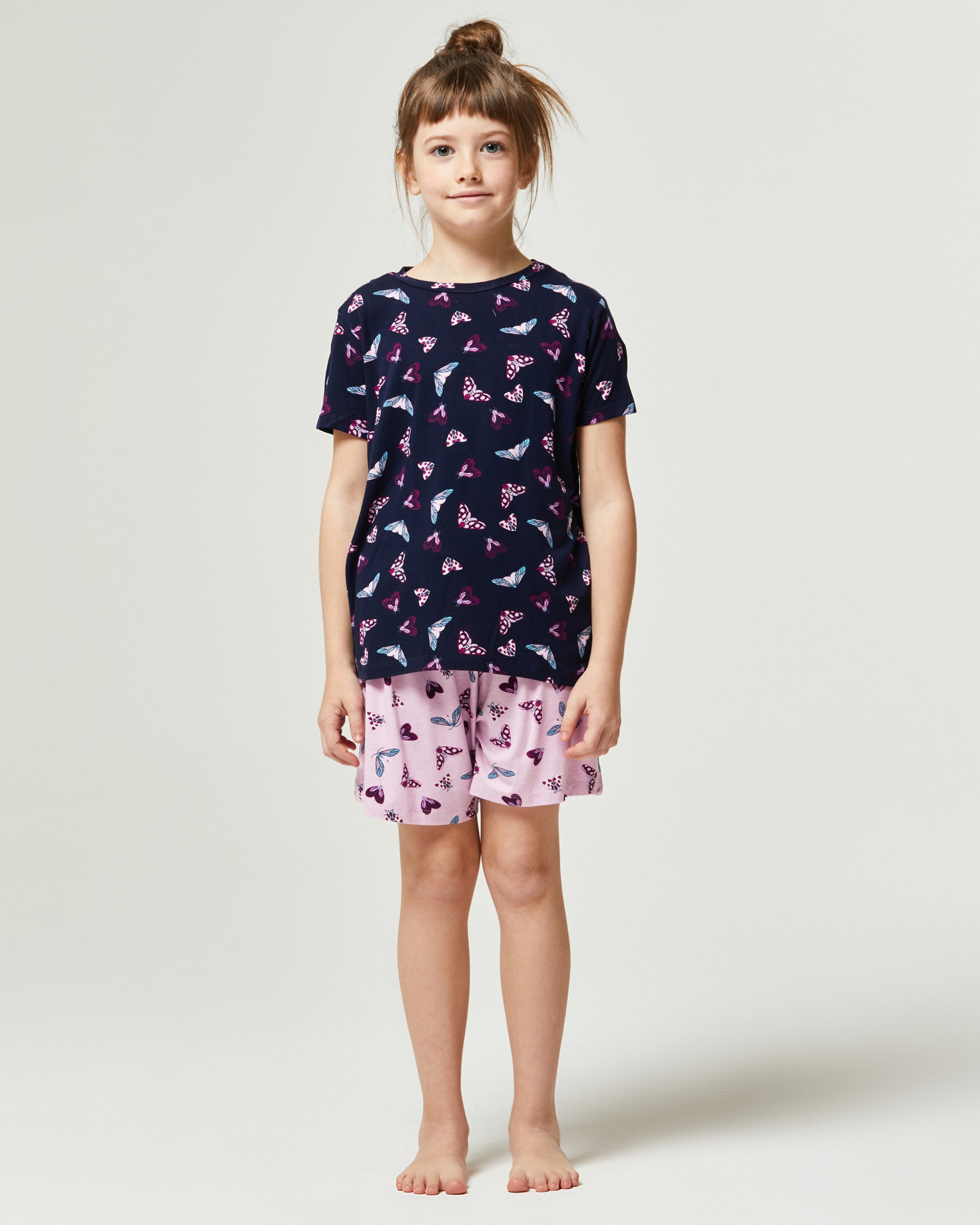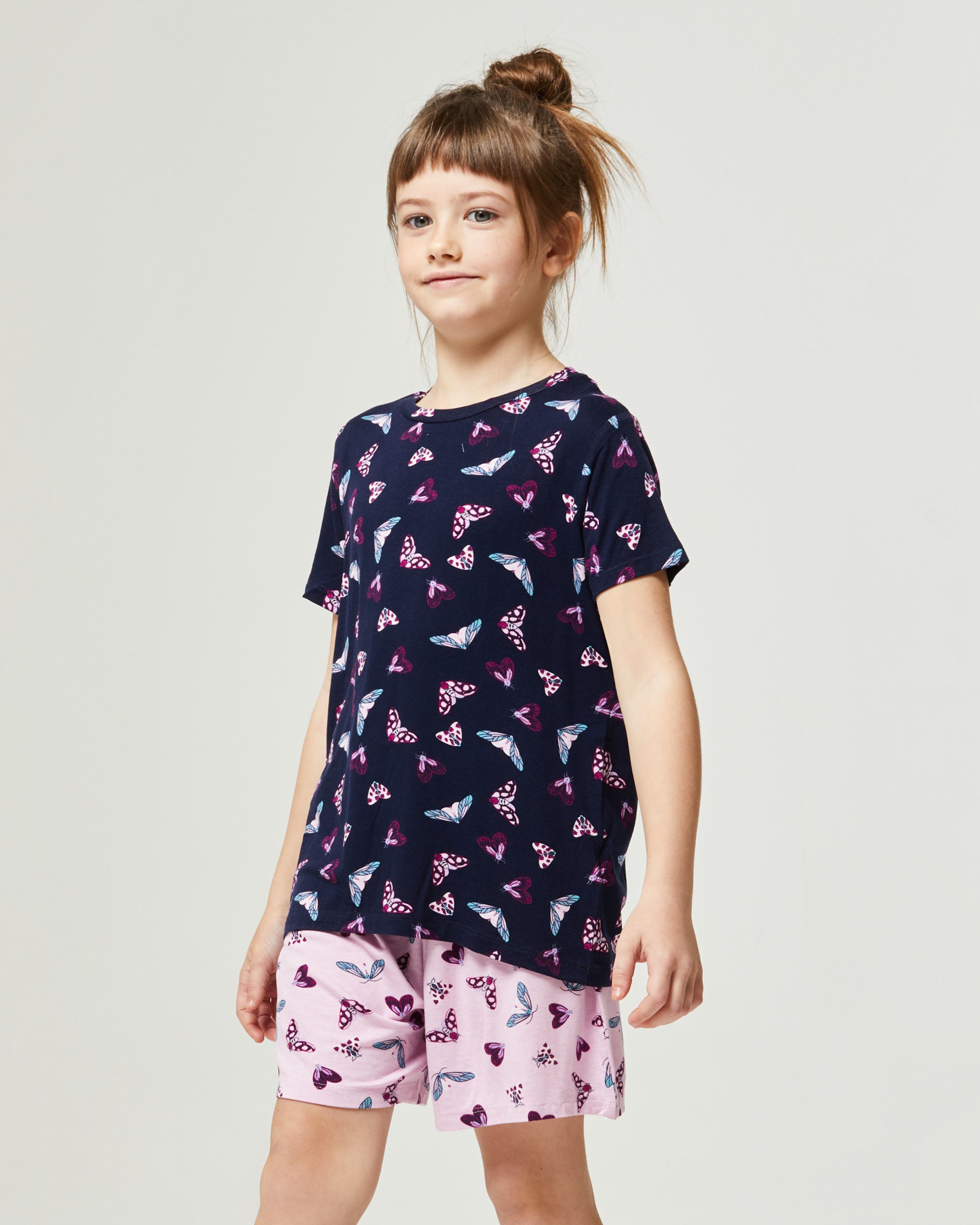 Ogni bambina diventerà vera fan della notte grazie al pigiama Brionia. Realizzato in morbida viscosa presenta una maglia a maniche corte abbinata col suo pantaloncino. La T-Shirt presenta un motivo con farfalle su tutto il modello che crea un look originale per ogni bambina mentre il pantaloncino richiama la fantasia della maglia con coulisse in vita. Perfetto per donare comfort nelle occasioni di relax o durante la notte.