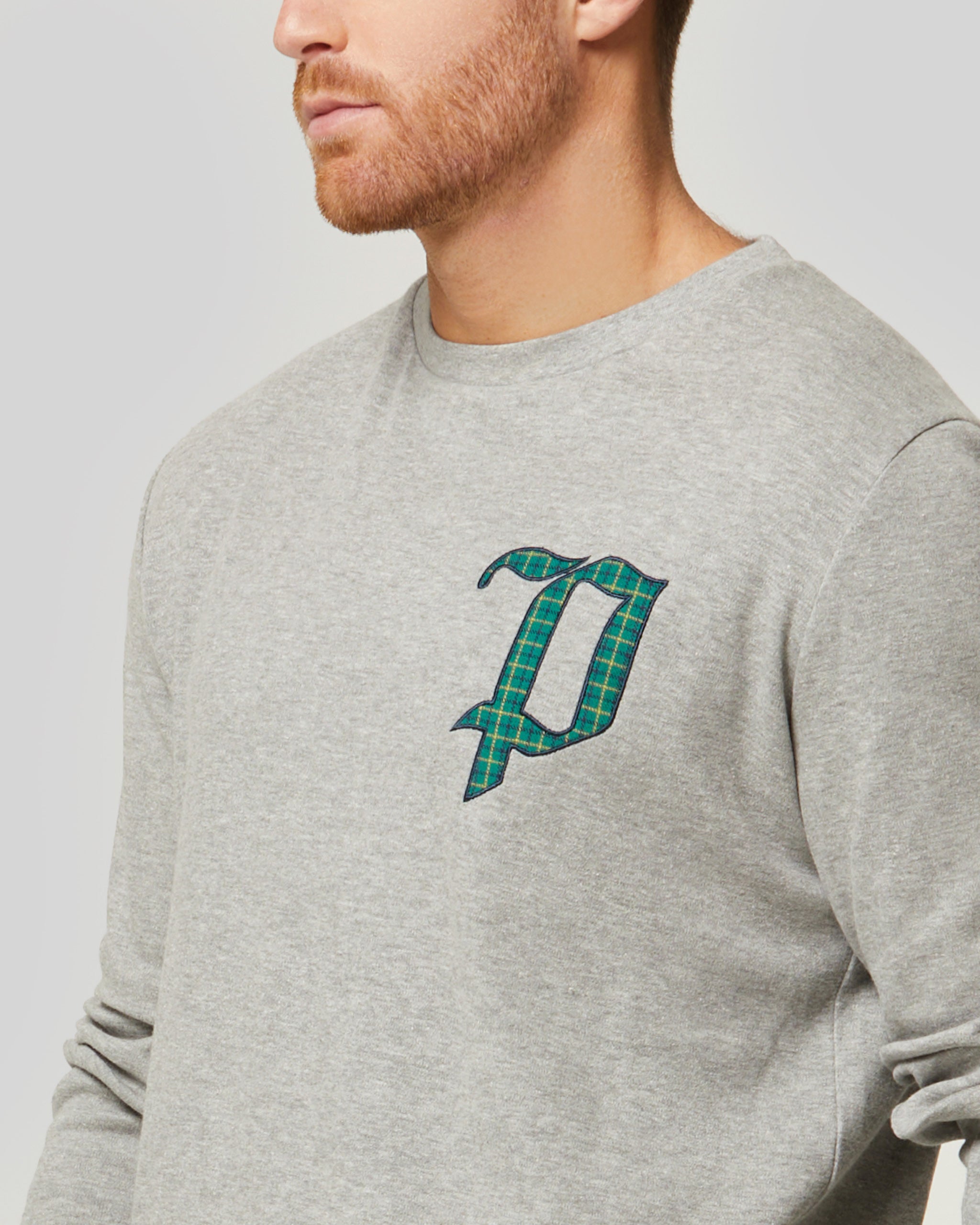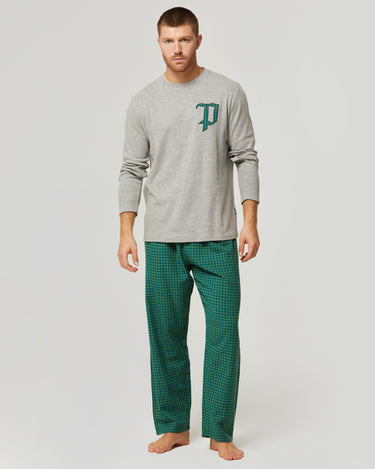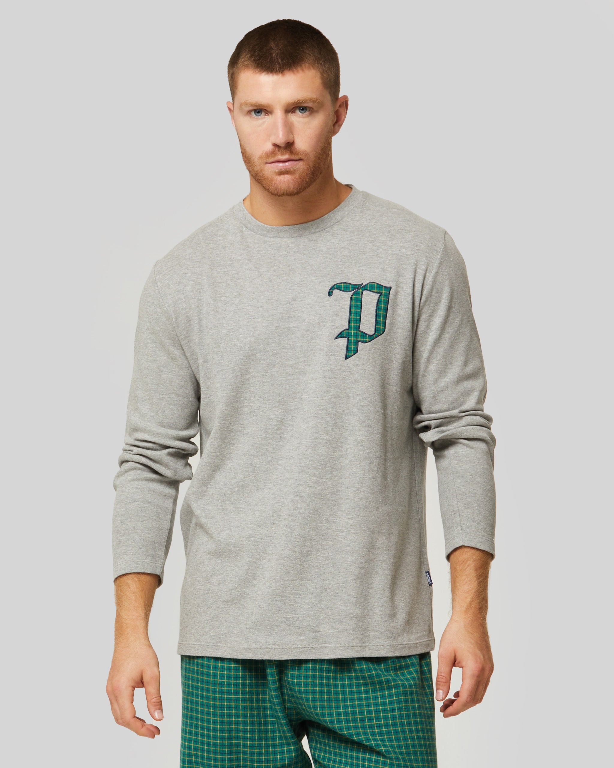Pullover hergestellt in Verriegelung Es ist keuchen In Baumwollflanell. Das Shirt ist einfarbig und hat einen Rundhalsausschnitt gestickter Buchstabe „P“. auf Herzhöhe. Die Hose besteht aus vertikal gestreiftem Flanell mit einem Gesäßtasche.