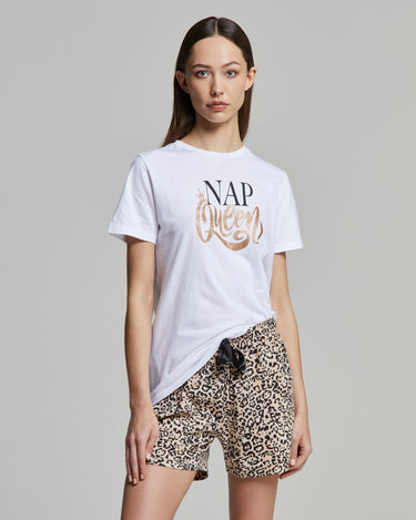 Kurzes Pyjama Frau aus Baumwolljersey. Weißes T-Shirt mit platziertem Druck. Shorts mit Leopardenmuster.
