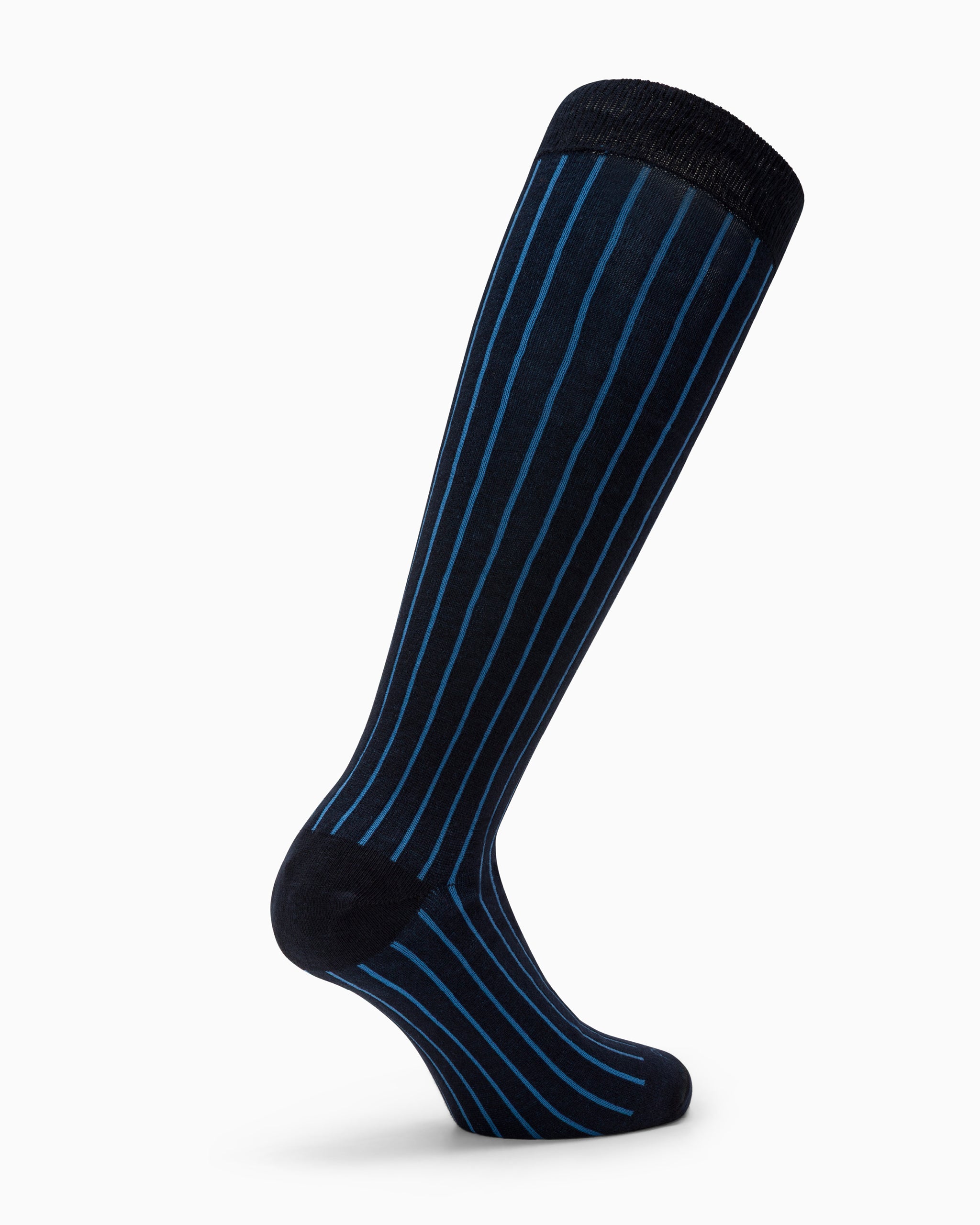 Long blue men's socks in warm cotton with a vertical striped design . They guarantee long-lasting comfort, are non-constricting, and leave no marks on the skin.