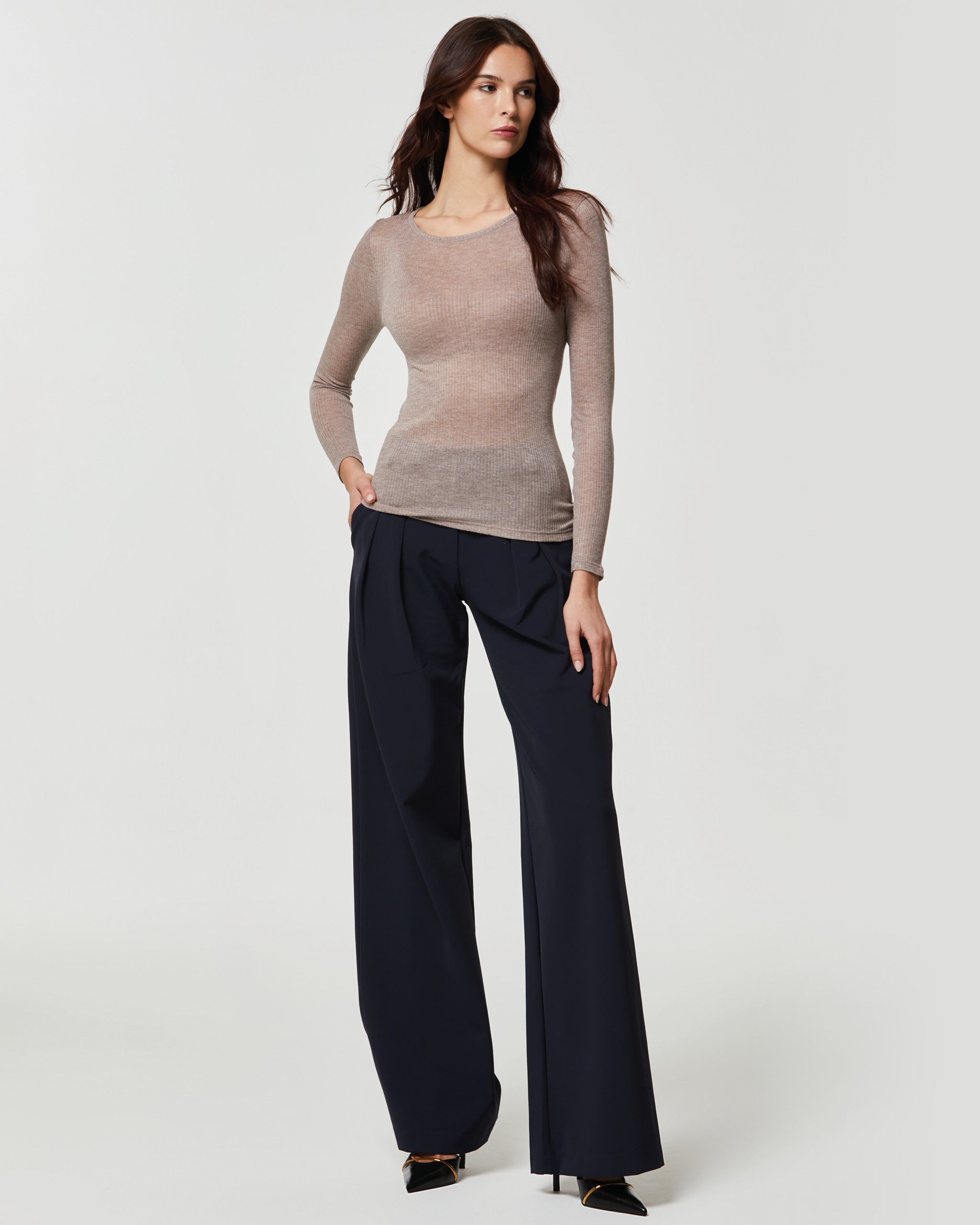 Boat -neck sweater crafted from ribbed modal cashmere , featuring a clean, refined silhouette. The fit is snug and comfortable, with no side seams for maximum freedom of movement. The fabric feels pleasantly soft thanks to its soft-touch effect. It stands out for its elegant ribbed knit that runs the length of the garment. Perfect as a base layer under a blazer or cardigan, but also wears alone for a chic everyday outfit.
