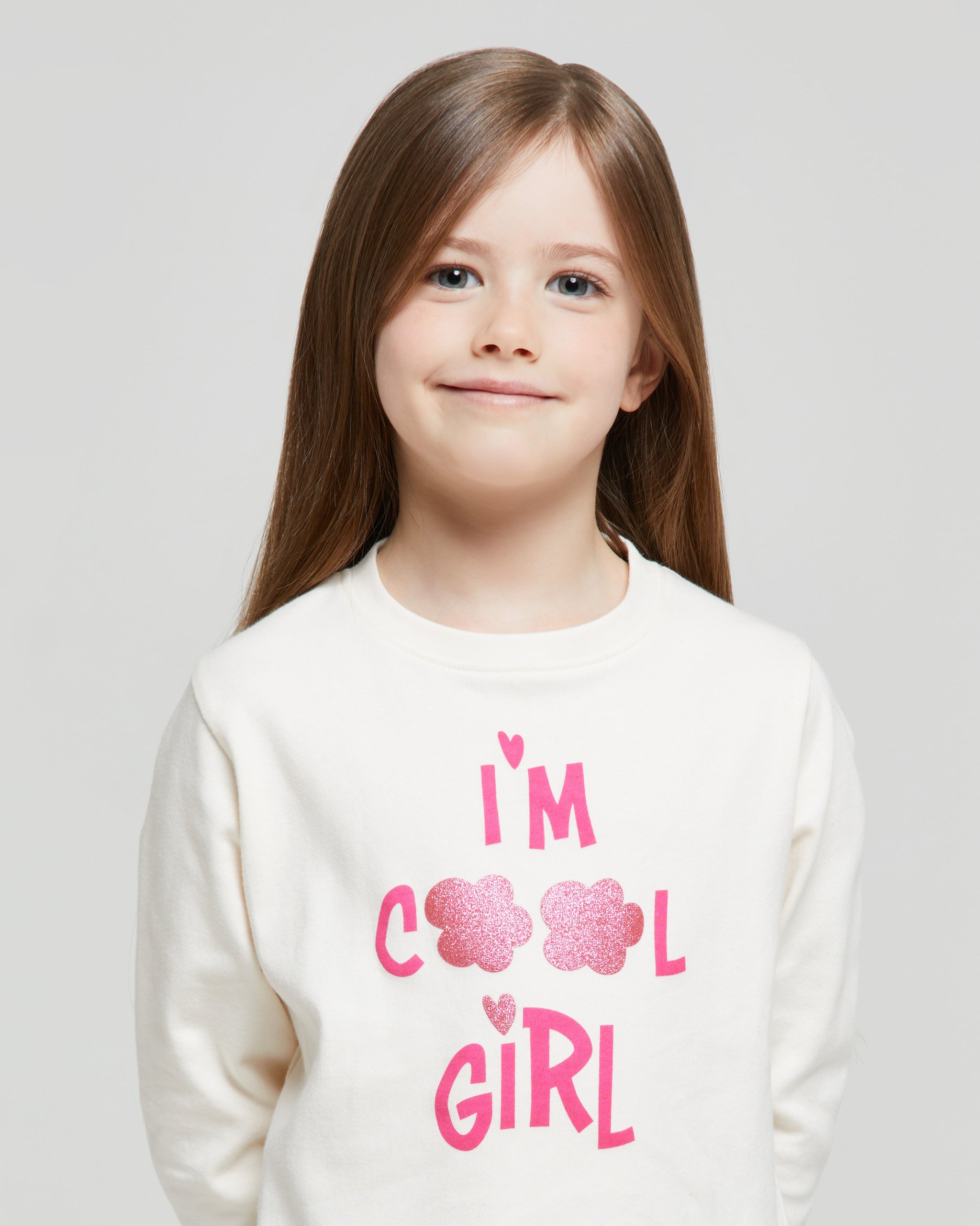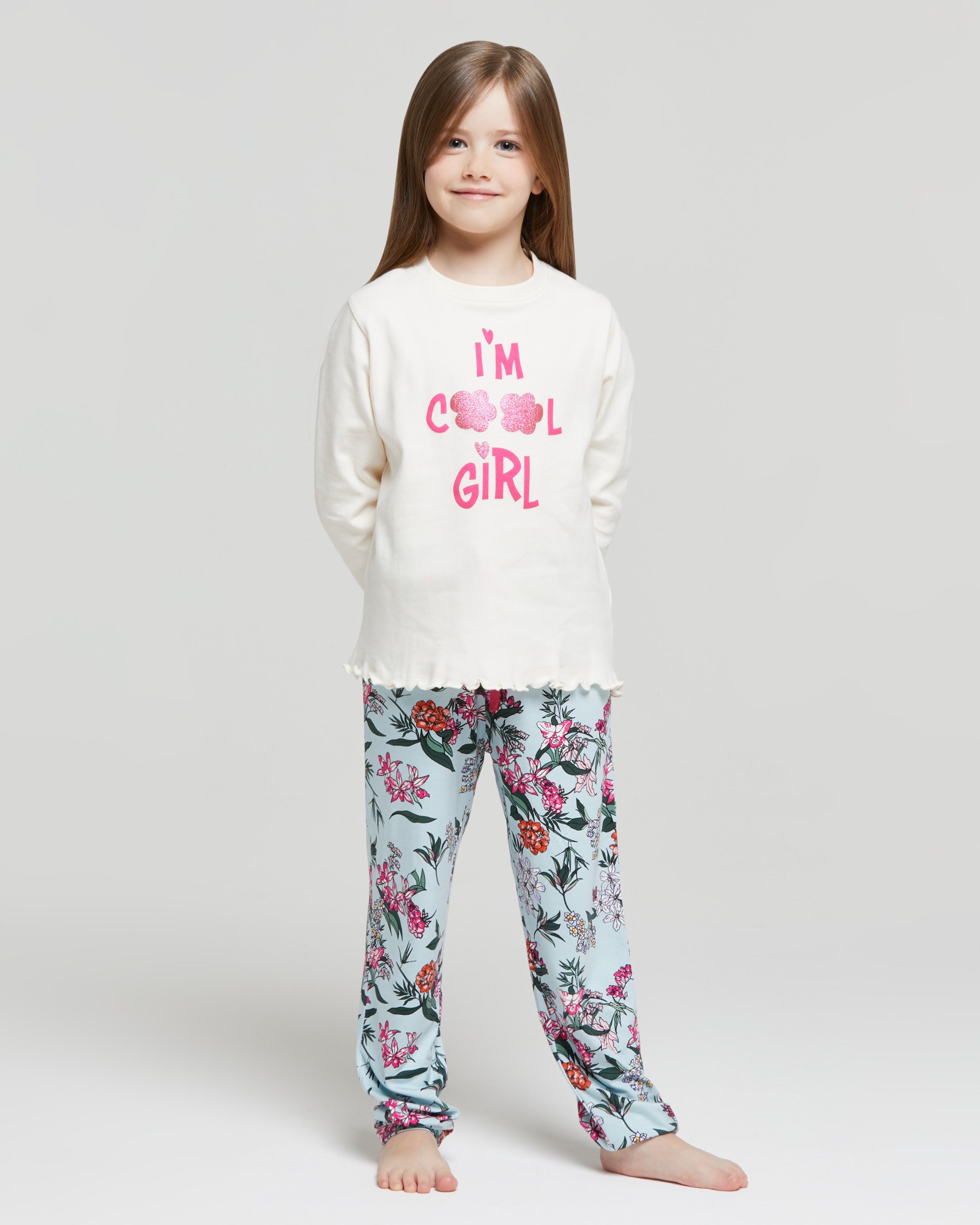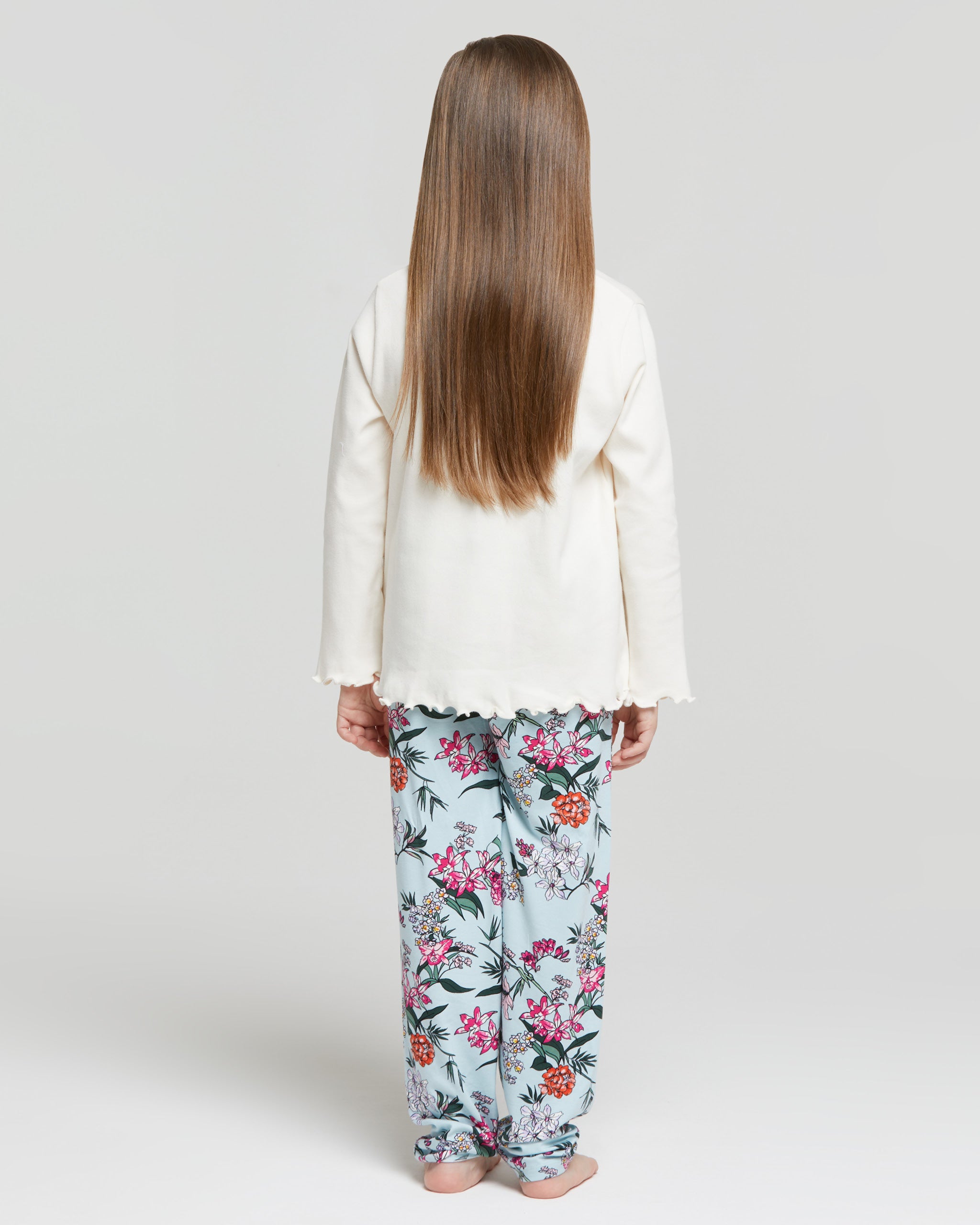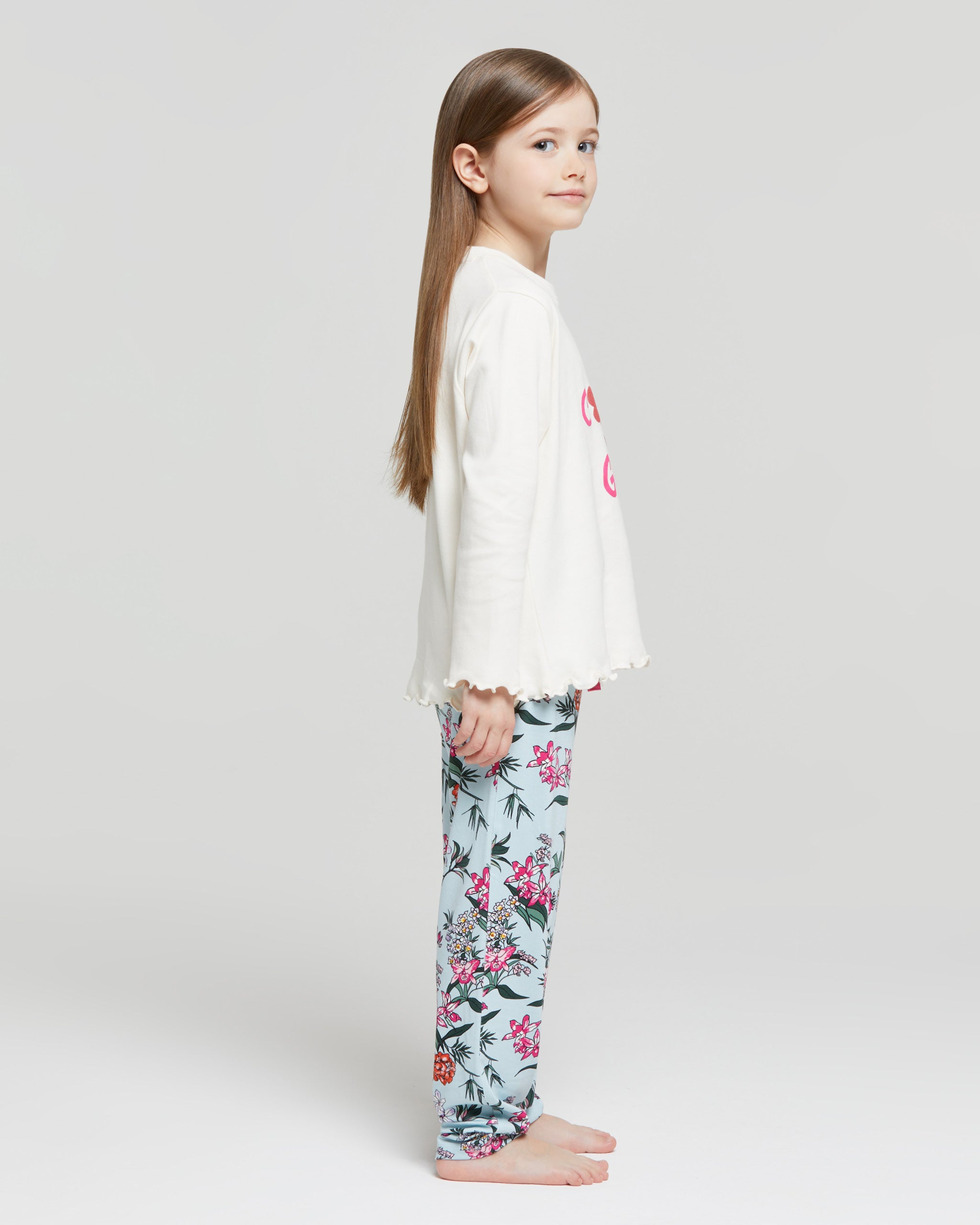 Warm cotton interlock sweater and soft viscose trousers. The sweater has a round neckline and a cute print. Viscose trousers with a floral print .