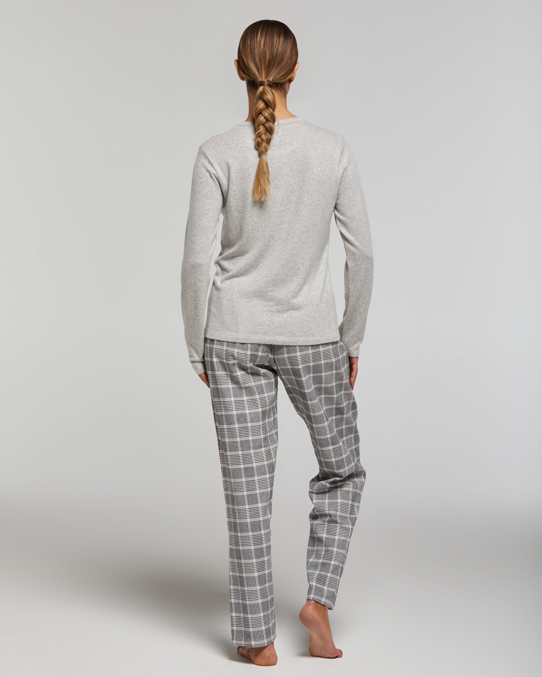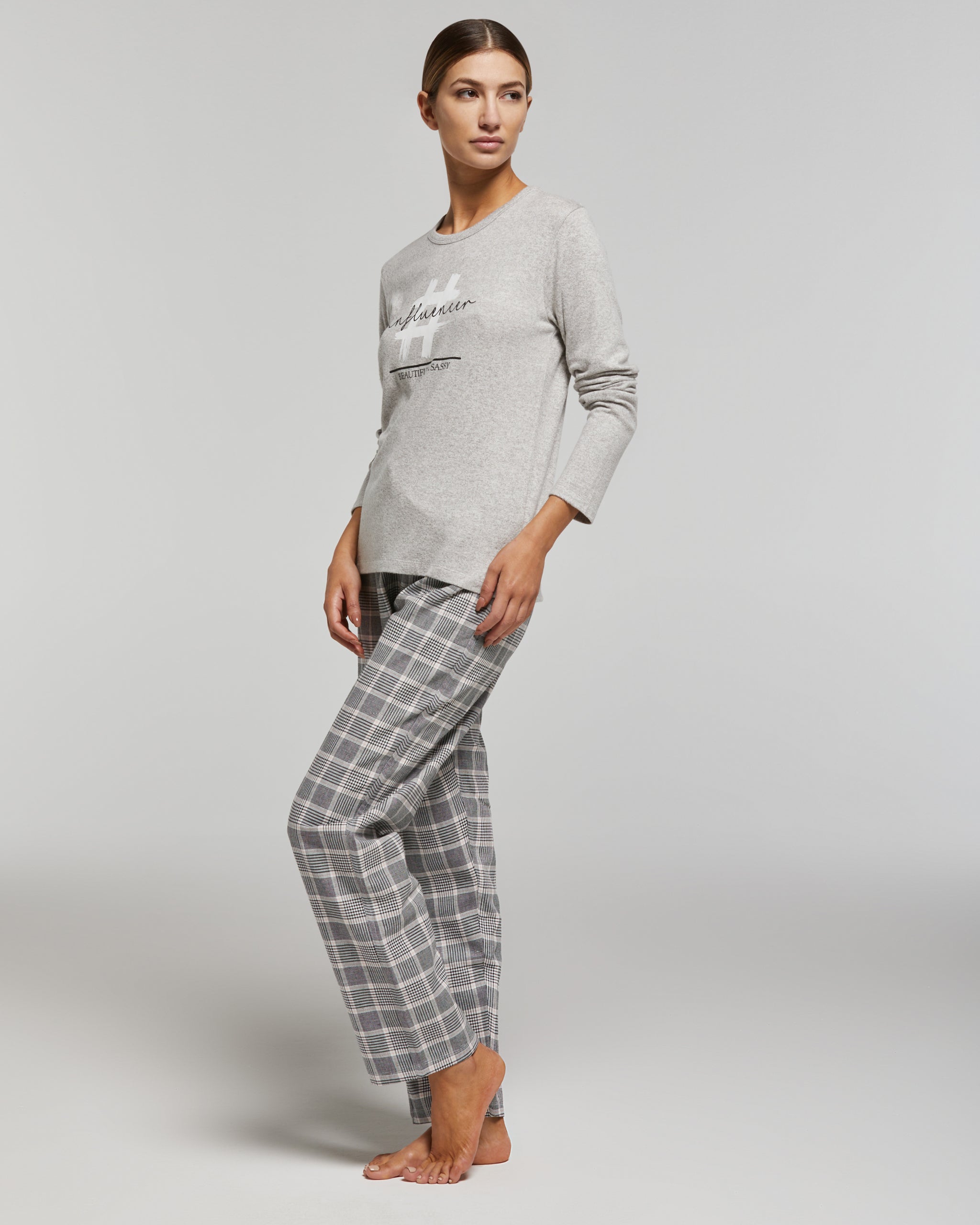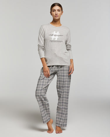 These long, melange gray women's pajamas consist of a soft viscose top and cotton flannel pants. The top features a round neck with an applique print. The flannel pants have a back pocket.