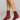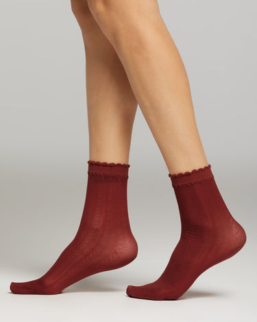 Un elegante calcetín burdeos de poliamida transparente, adornado con un borde caracterizado por un diseño de gorra y un distintivo patrón geométrico.