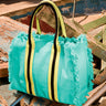 Bolsa de lona de algodón con asas de piel completamente combinable con los trajes de baño. Cómoda y espaciosa, es un accesorio imprescindible para el verano y es ideal para la playa, también para completar el look.