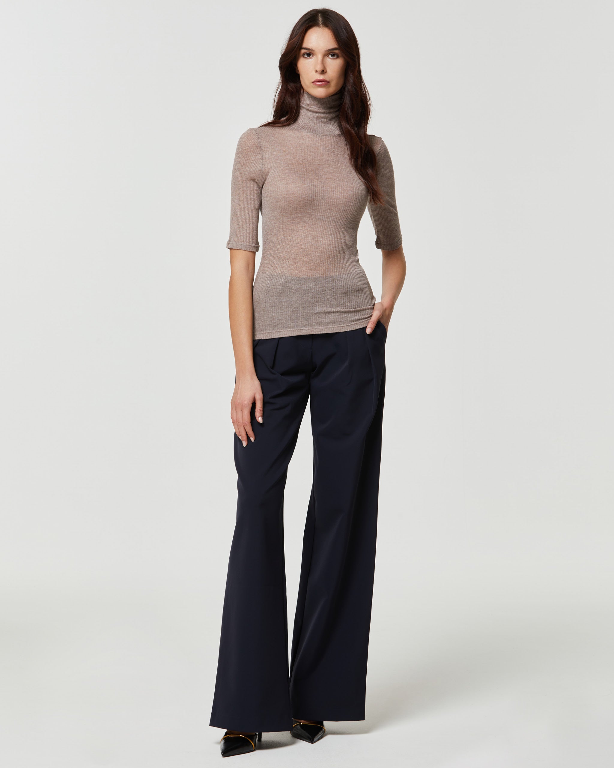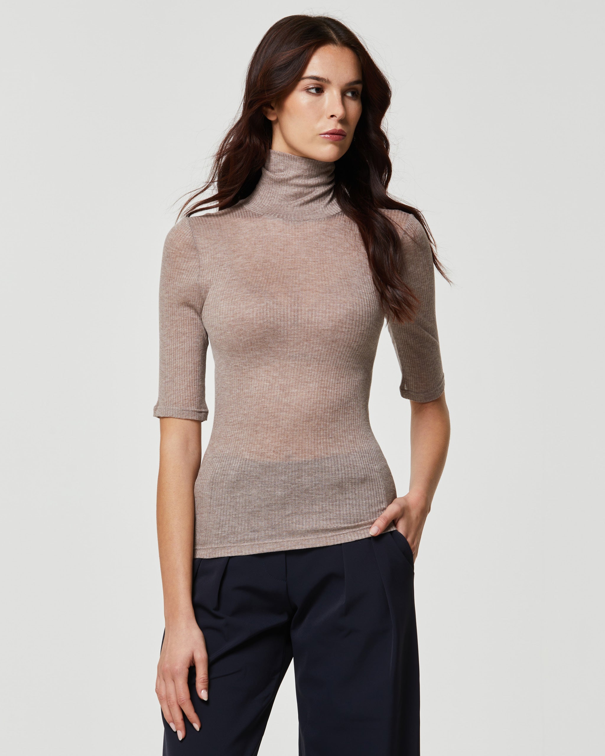 Jersey de manga corta en modal cachemira con cuello alto, caracterizado por un trabajo de canalé que realza la silueta y garantiza una elasticidad natural. Sin costuras en los costados para asegurar la máxima comodidad. El tejido es suave y delicado con la piel, haciendo que la prenda sea extremadamente versátil: ideal para combinar debajo de chaquetas y blazers.