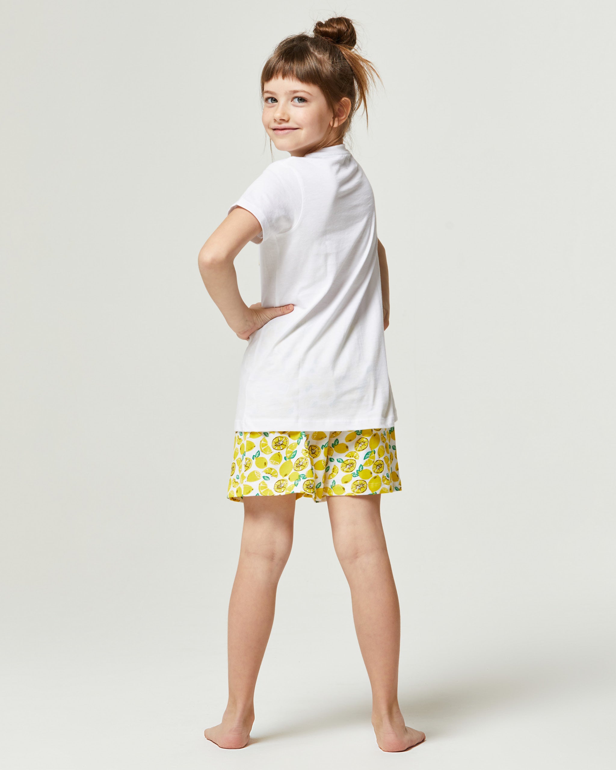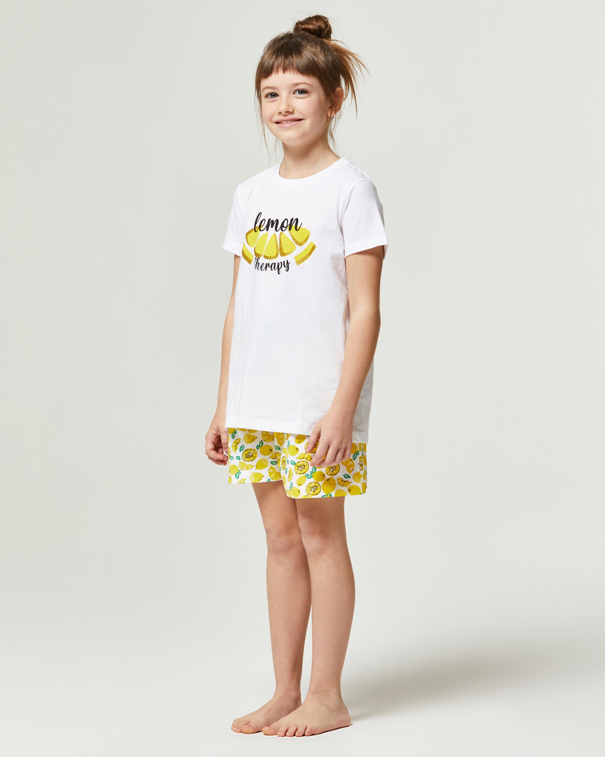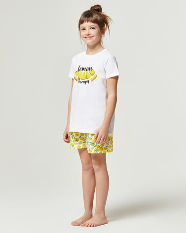 Encontrar calidad y suavidad en los productos para tu chica no siempre es fácil, por eso el pijama Bromelia se adapta a cada necesidad, incluso a las más pequeñas. La camiseta de manga corta presenta una impresión en el frente que crea un look original, mientras que el pantalón corto tiene un diseño de "limones" con cordón en la cintura. El resultado es un conjunto ideal que proporciona todo lo que necesita tu chica.