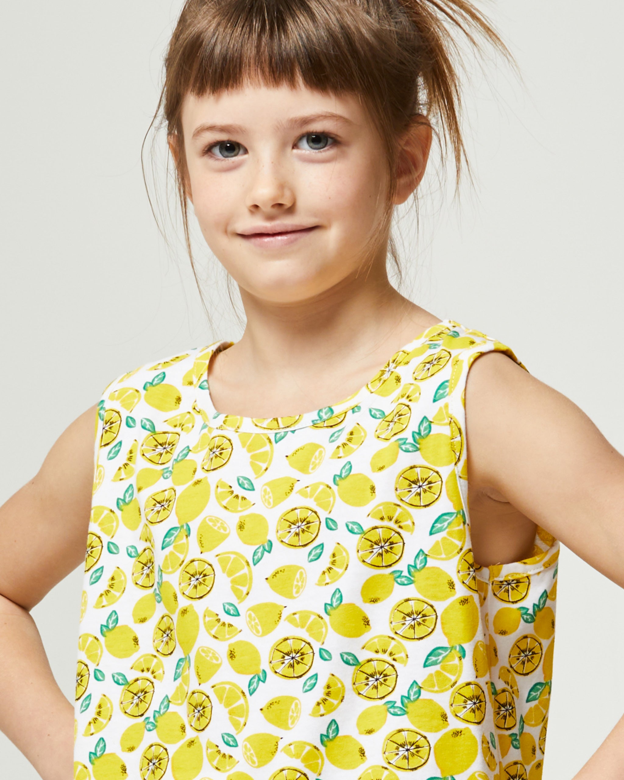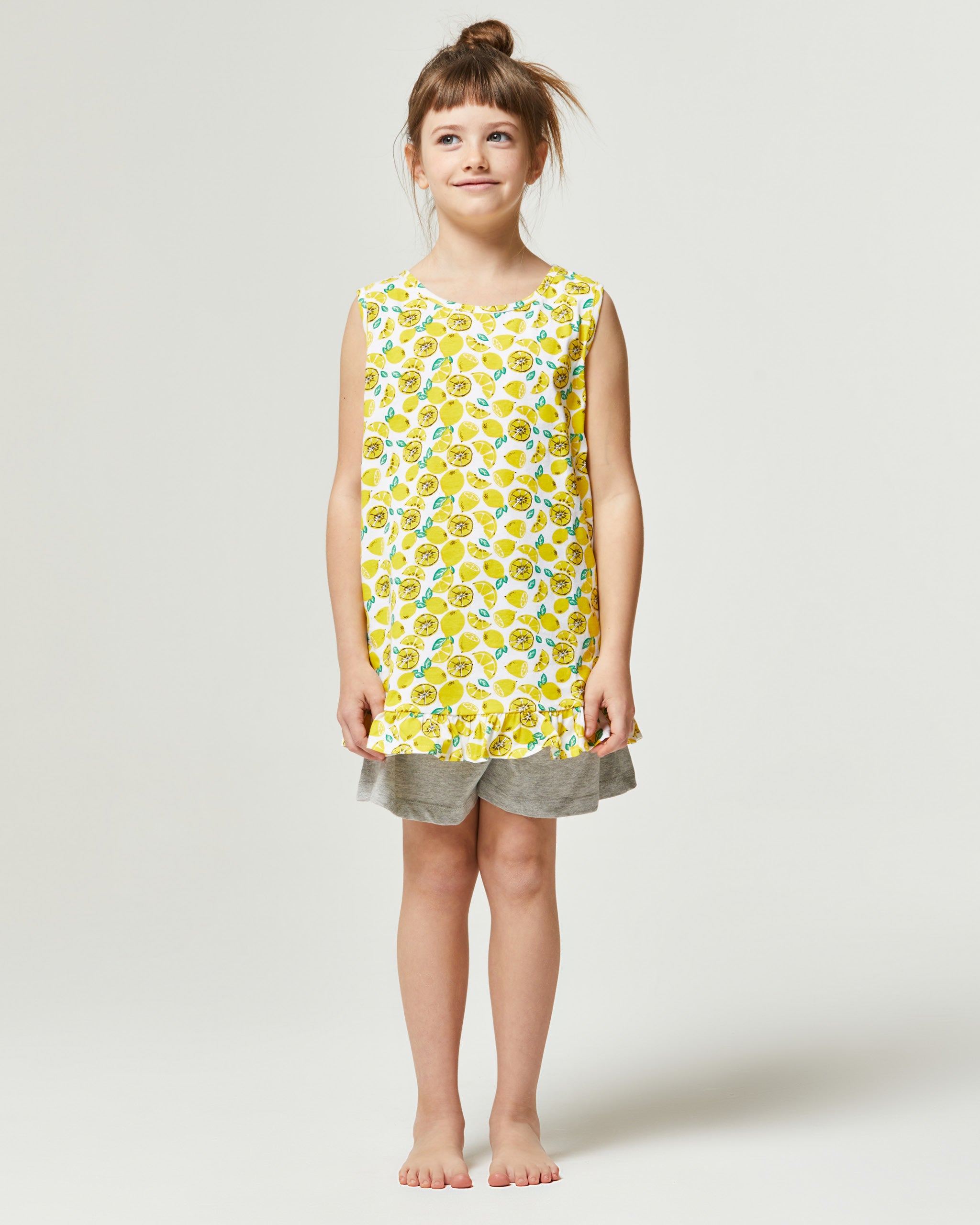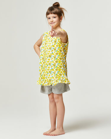 El pijama corto Jogioba presenta una camiseta a juego con su pantalón corto: La camiseta tiene un diseño que representa “limones” mientras que el pantalón corto de color sólido tiene un cordón en la cintura para ajustar la adherencia. No te queda más que ver a tu chica crecer mientras vive sus aventuras vistiendo la verdadera comodidad de Pompea.