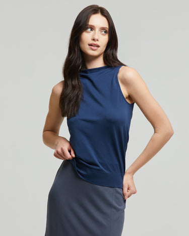 La comodidad y el estilo se fusionan en esta camiseta sin mangas azul para mujer con escote barco. Realizada con tecnología sin costuras, ofrece un ajuste regular.