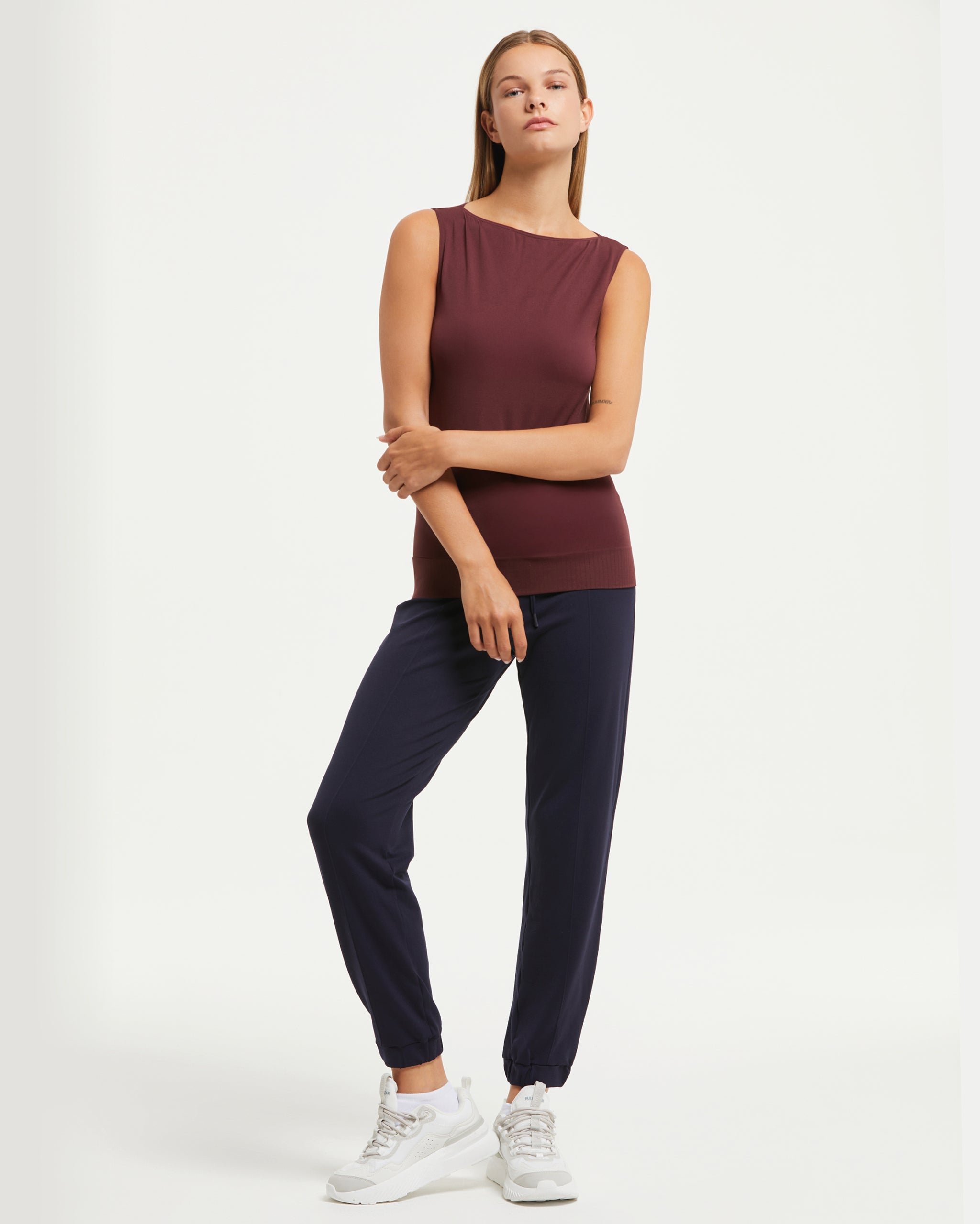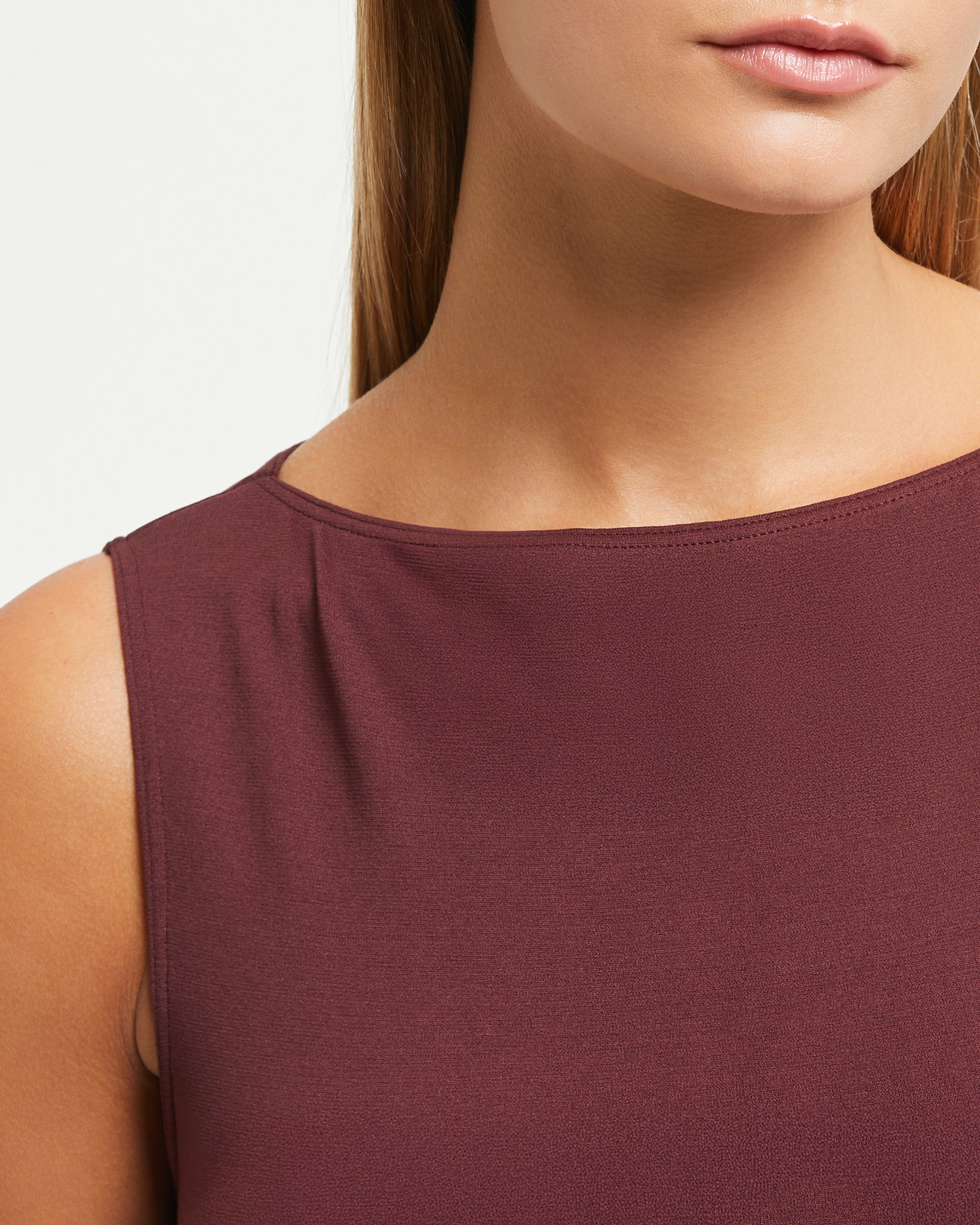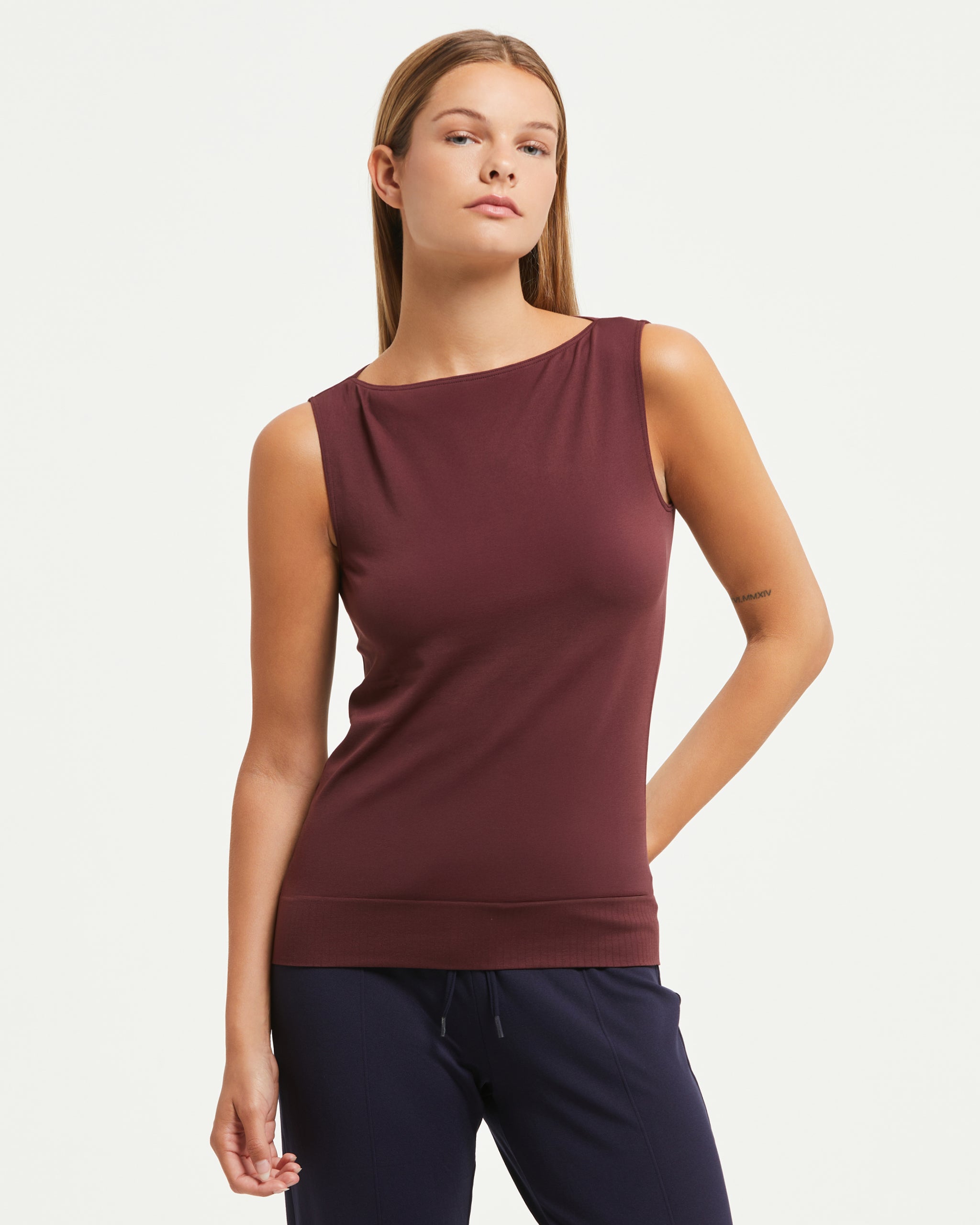 Maglia smanicata de mujer burdeos con escote barco realizada con tecnología seamless. Ajuste regular fit adaptable que no aprieta ni deja marcas en la piel. Tejido transpirable, suave al tacto y envolvente. Presenta líneas limpias y esenciales. Easy care se lava y seca rápidamente sin necesidad de planchado. Ideal para cualquier ocasión para completar el outfit con posibilidad de crear un total look mix & match.
