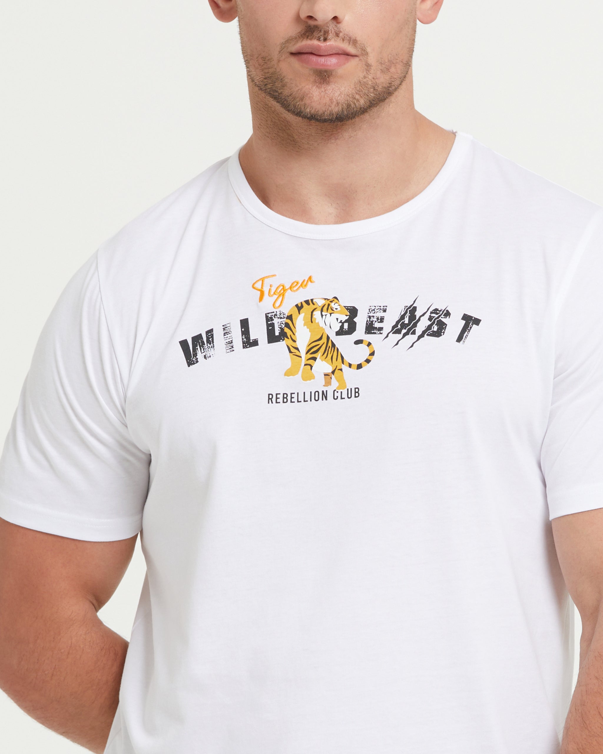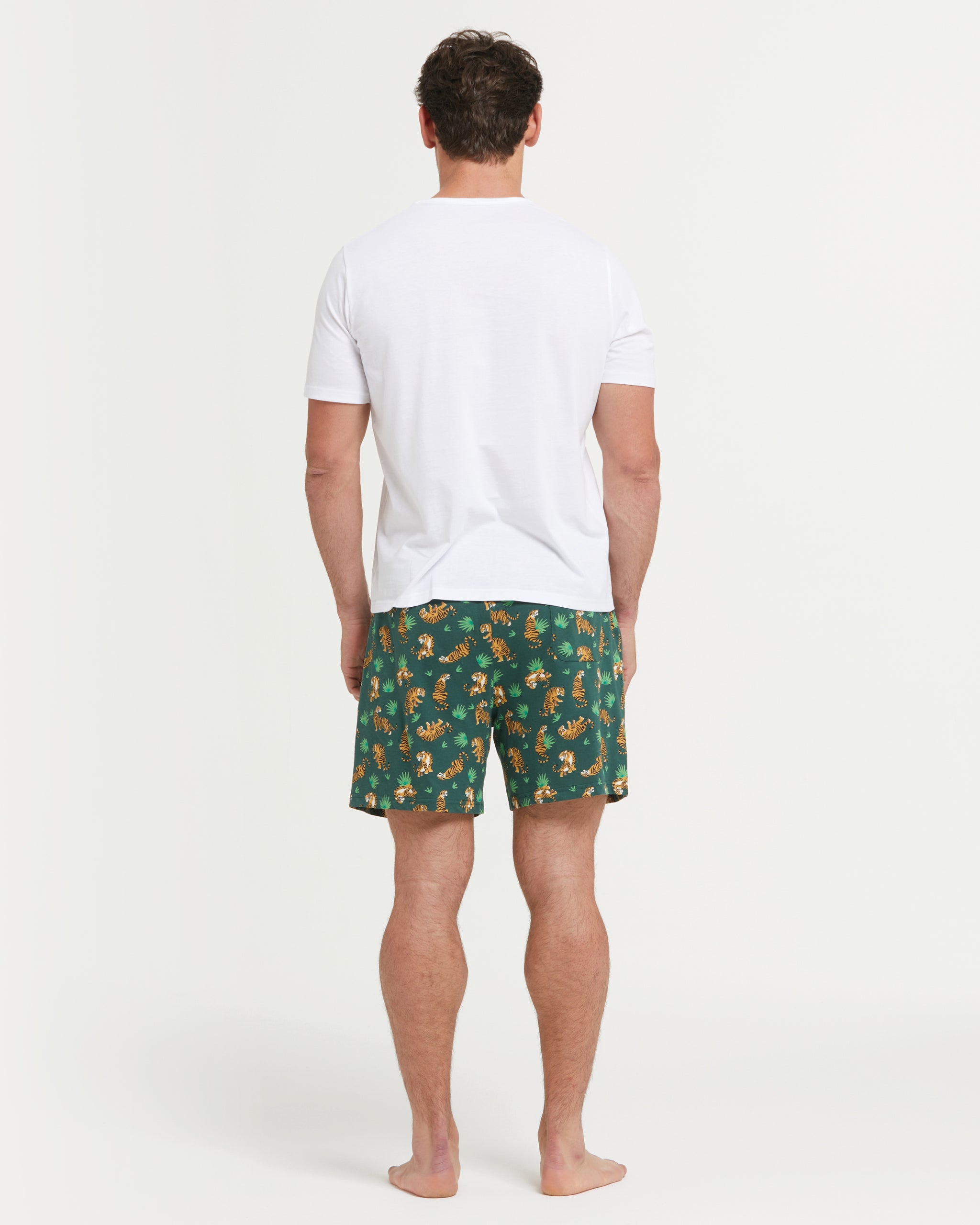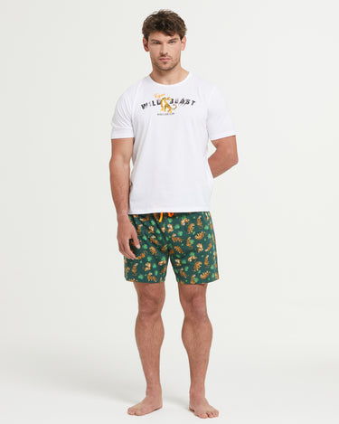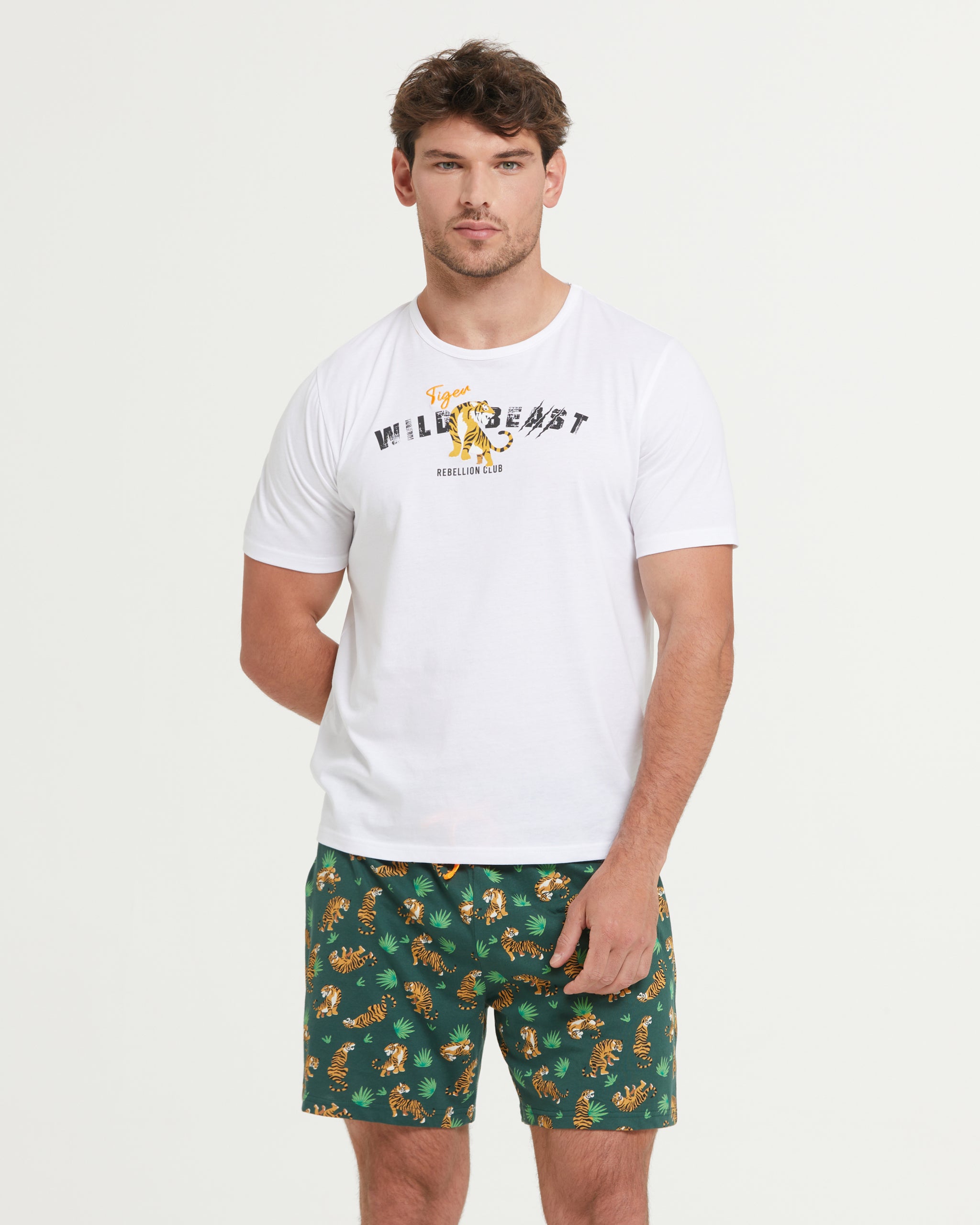 Pyjama homme en jersey de coton. T-shirt blanc avec col rond et impression centrale. Short à imprimé tropical sur fond vert foncé.