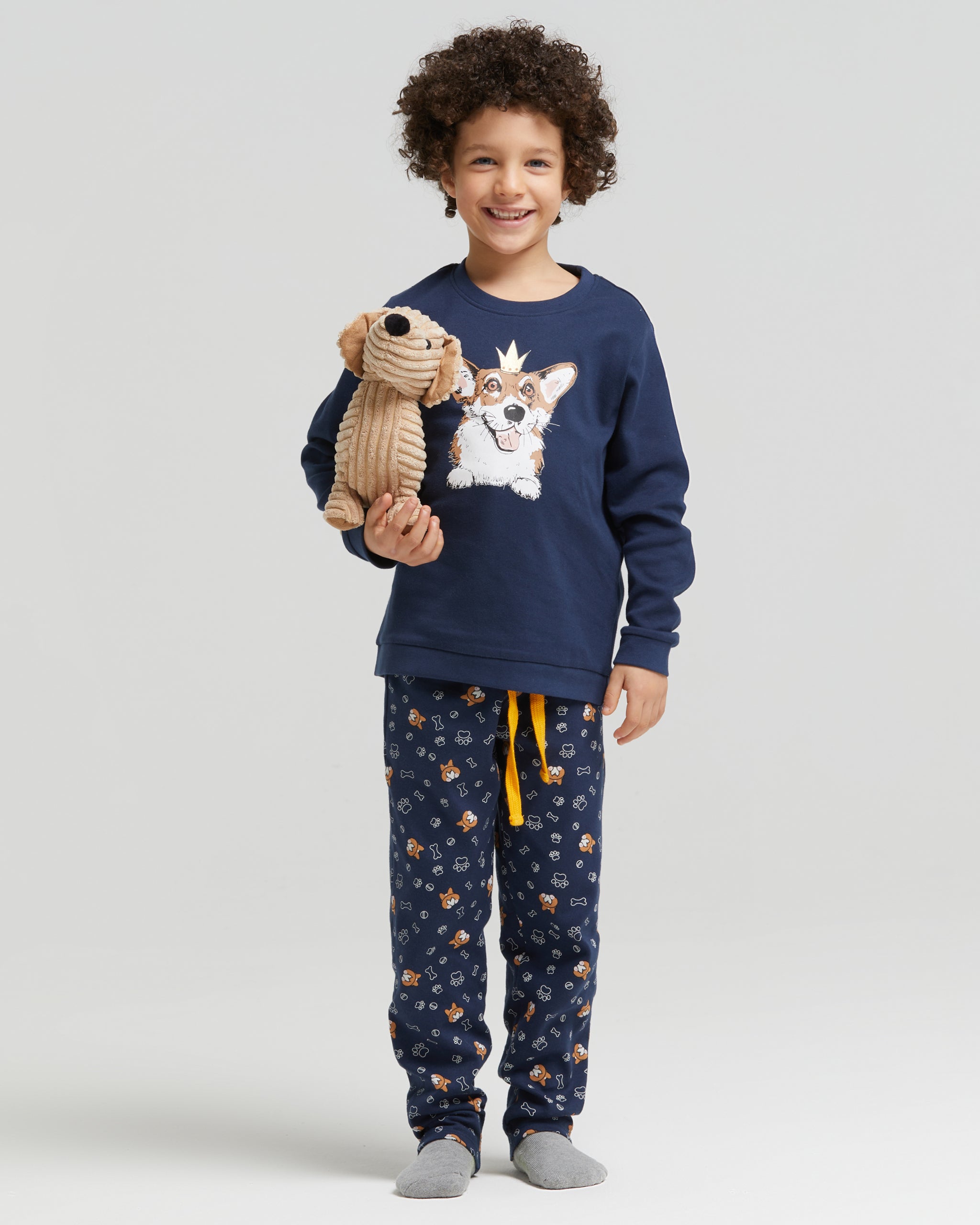 Ce pyjama long pour garçon est composé d'un haut et d'un pantalon en coton chaud . Le haut uni présente une encolure ronde et un joli imprimé chien. Le pantalon arbore un imprimé chien amusant.