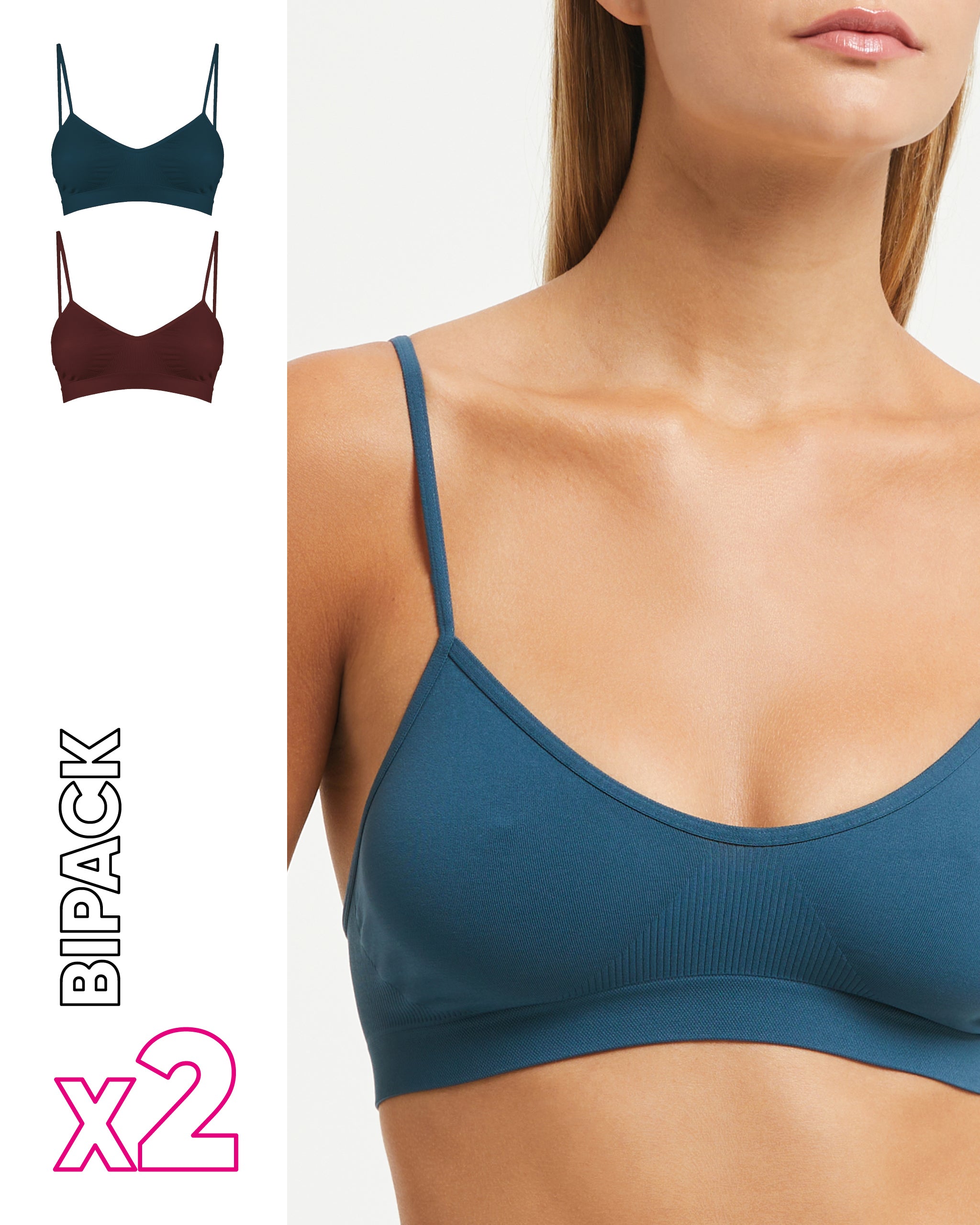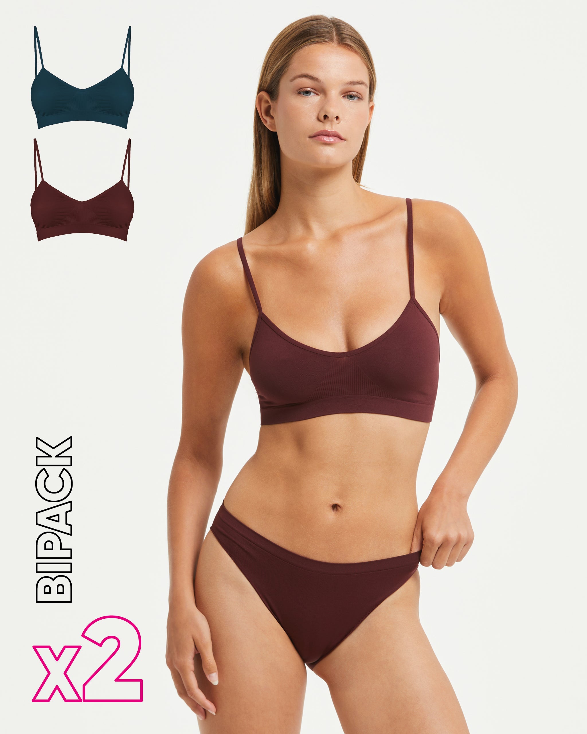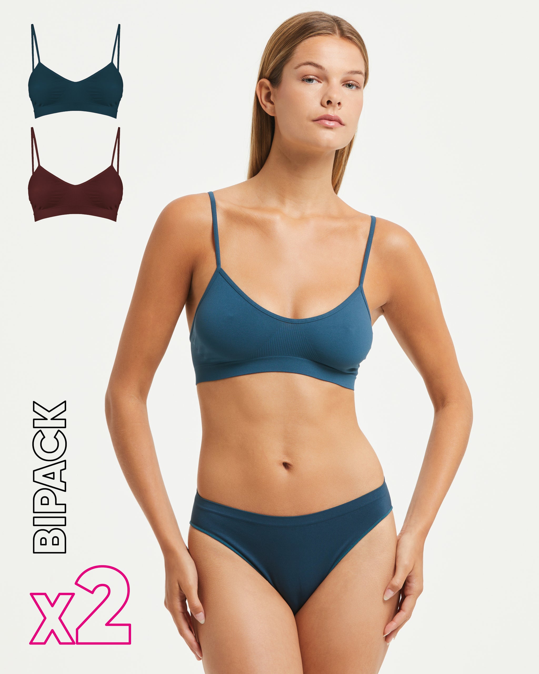 La confezione contiene due paia dello stesso articolo in due differenti varianti colore: una brassiere color bordeaux e una brassiere color pavone.