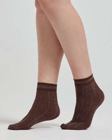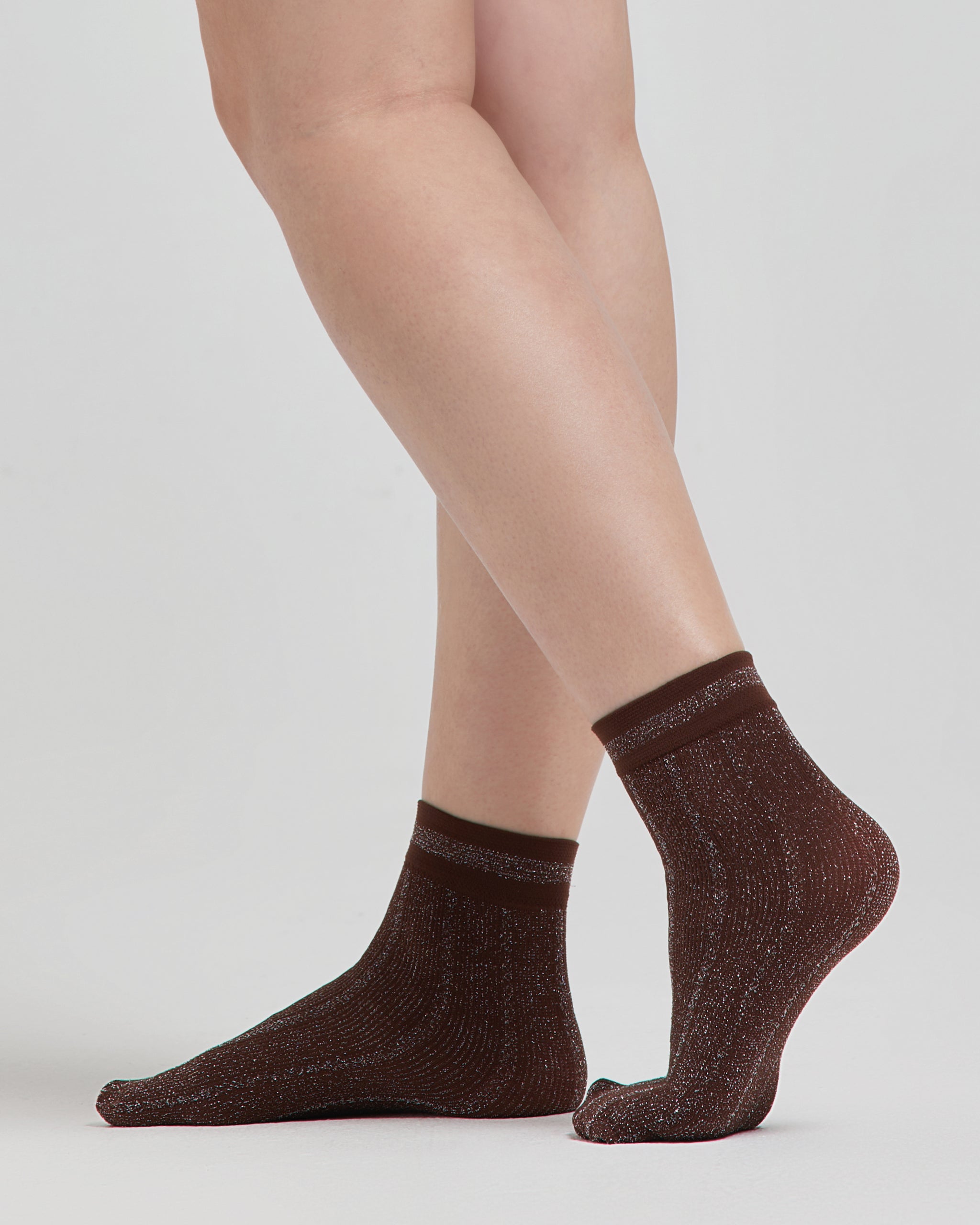 Calzino opaco in poliammide color cioccolato con motivo a righe e polsino in lamé. Un design che combina eleganza e modernità, ideale per chi apprezza i dettagli sofisticati. Il motivo conferisce un tocco elegante, mentre il polsino in lamé offre un accento di stile sobrio ma d’impatto.