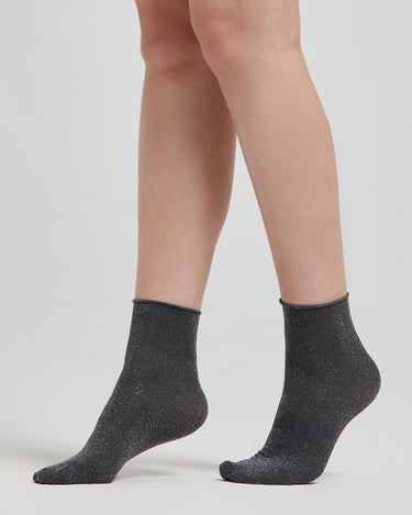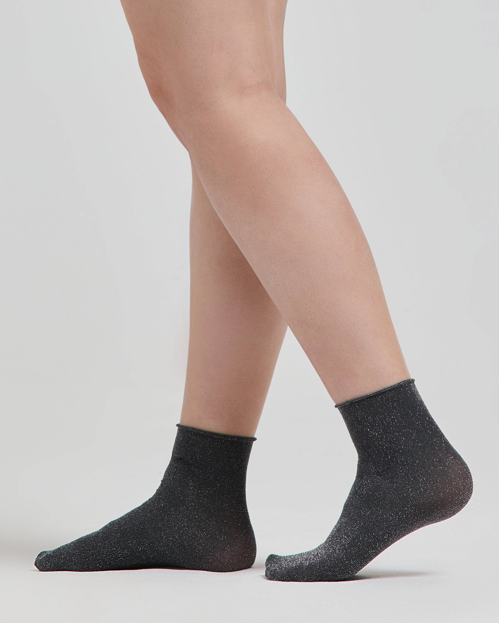 Calzino antracite e silver coprente in poliammide privo di bordo in lamé. Lineare e minimalista, è progettato per chi desidera un tocco di originalità senza compromettere la semplicità. La finitura in lamé conferisce un dettaglio sottile ma caratteristico, perfetto per completare look sia casual che più eleganti.
