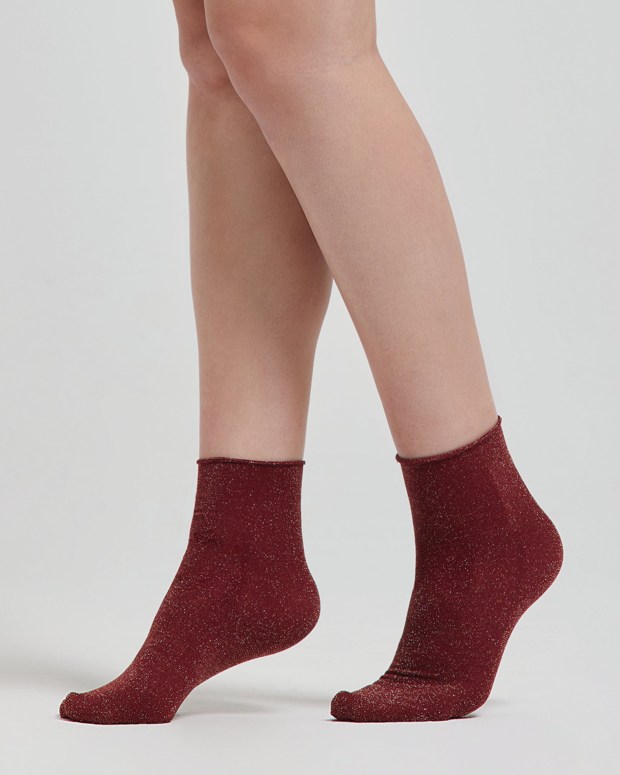Calzino coprente borgogna e oro in poliammide privo di bordo in lamé. Lineare ed essenziale, è realizzato per chi desidera un accento di originalità senza abbandonare la semplicità. La finitura in lamé fornisce un particolare delicato ma distintivo, perfetto per completare outfit sia casual che più eleganti.