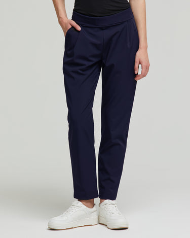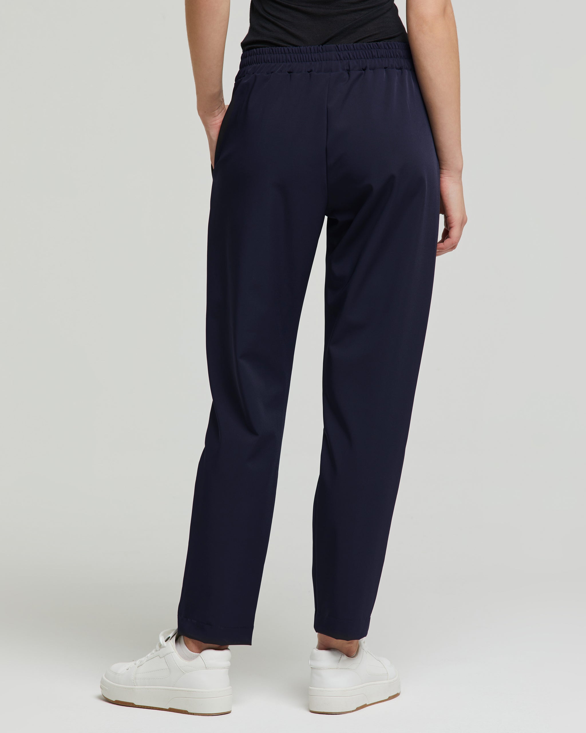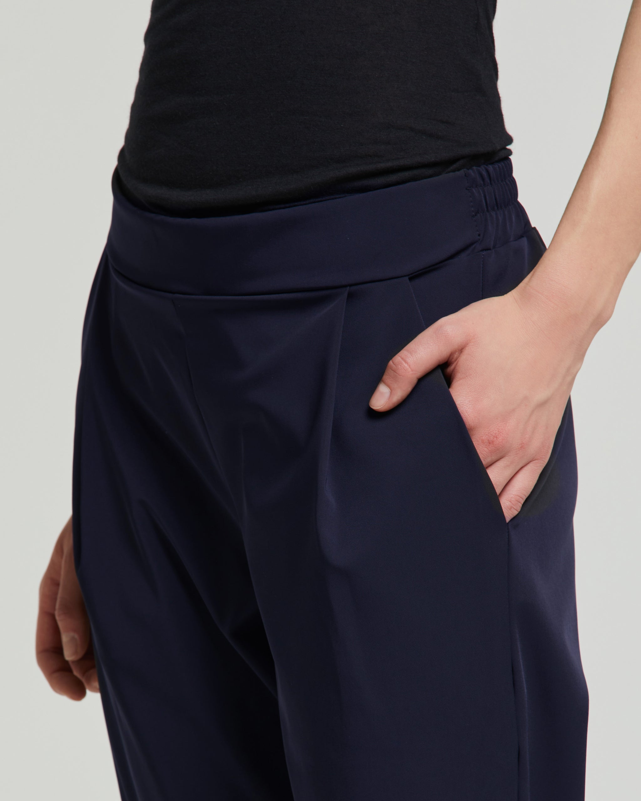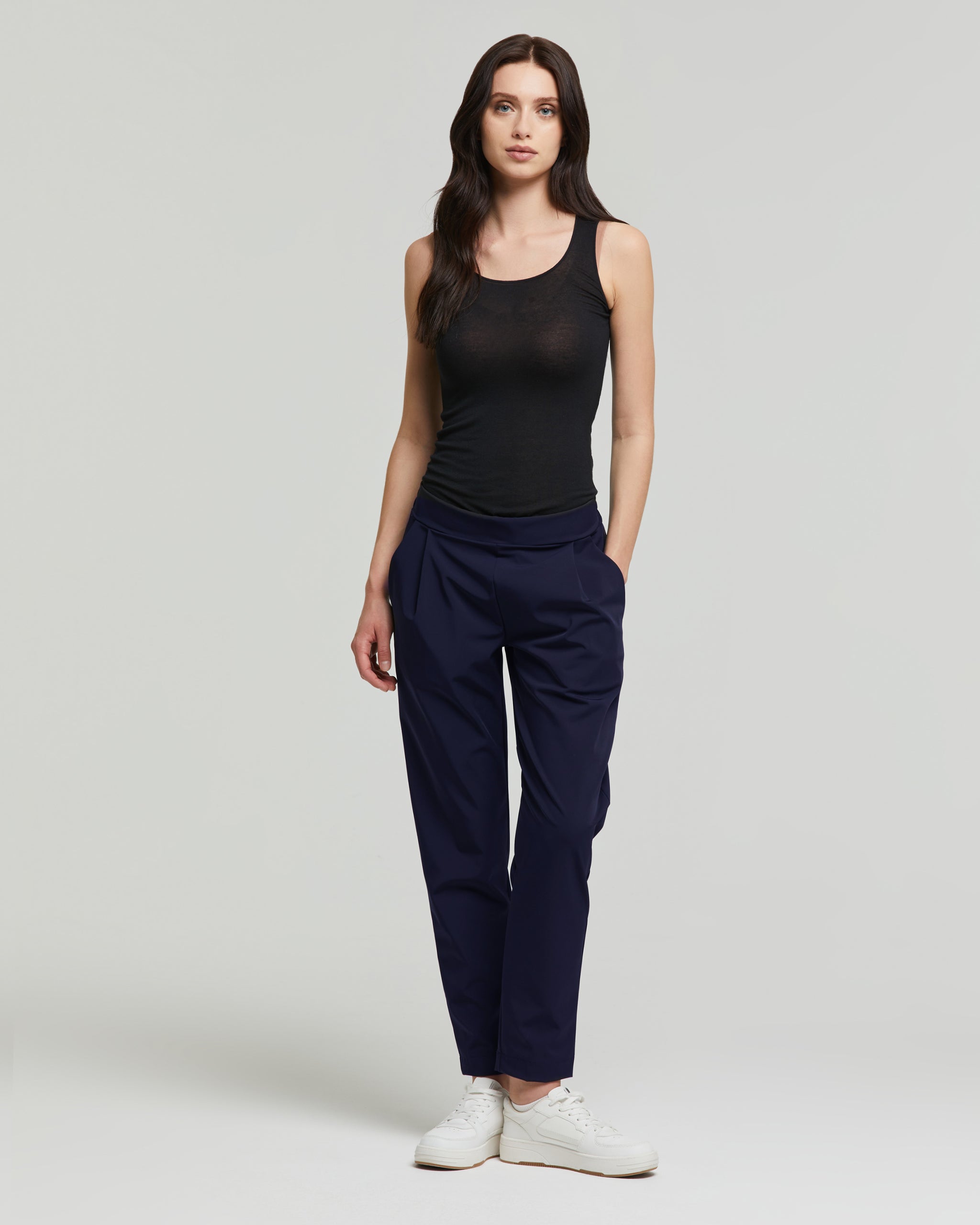 Il pantalone da donna blu navy Sara è un articolo essenziale e versatile, adatto a ogni occasione, sia formale che informale. È dotato di comode tasche laterali e di un risvolto interno alla caviglia, con una fascia elastica in vita che assicura una vestibilità confortevole. Fitting regular. Un indumento pratico e multifunzionale per ogni outfit, perfetto anche per l'uso quotidiano in ufficio ad esempio.