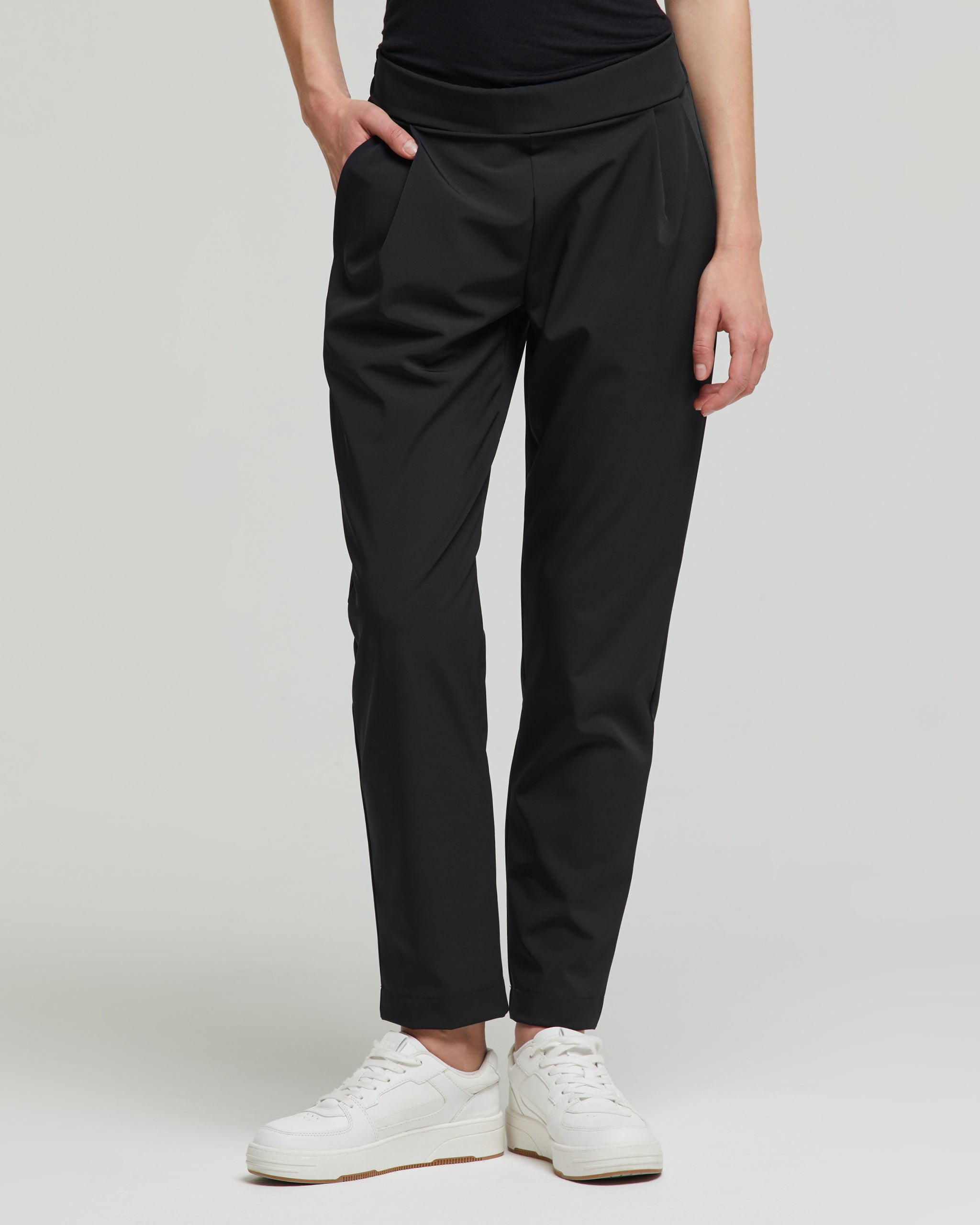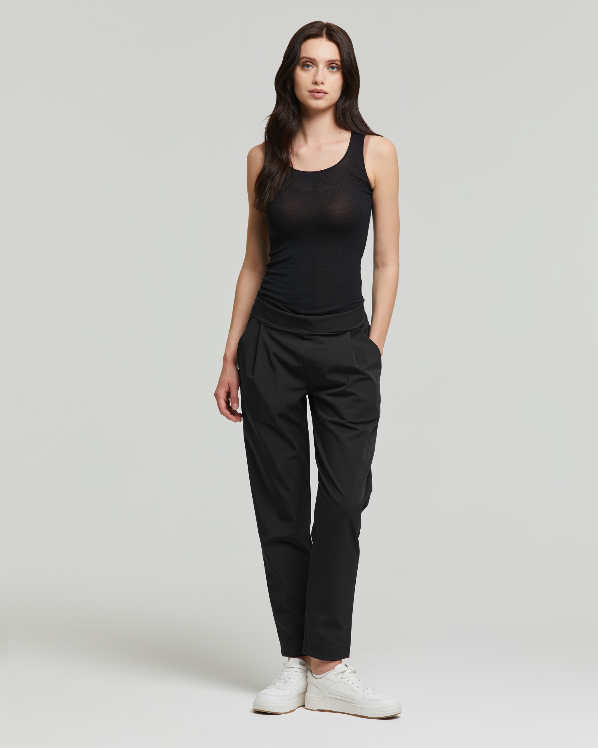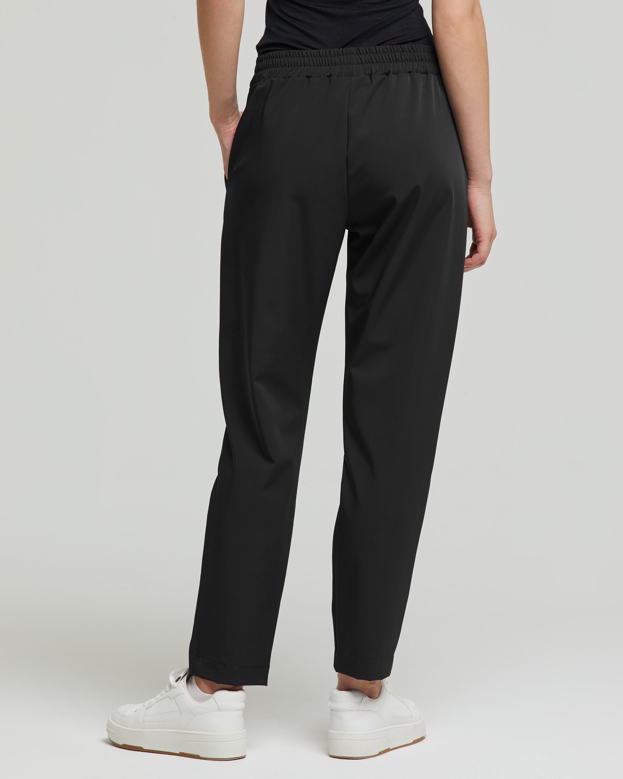 Il pantalone nero da donna Sara è un capo indispensabile e adattabile, perfetto per ogni situazione, sia formale che informale. Presenta delle pratiche tasche laterali e un risvoltino interno alla caviglia, con una fascia elastica in vita per garantire una vestibilità comoda. Fitting regular. Un capo pratico e versatile per ogni look, ideale anche per l'uso quotidiano in ufficio ad esempio.