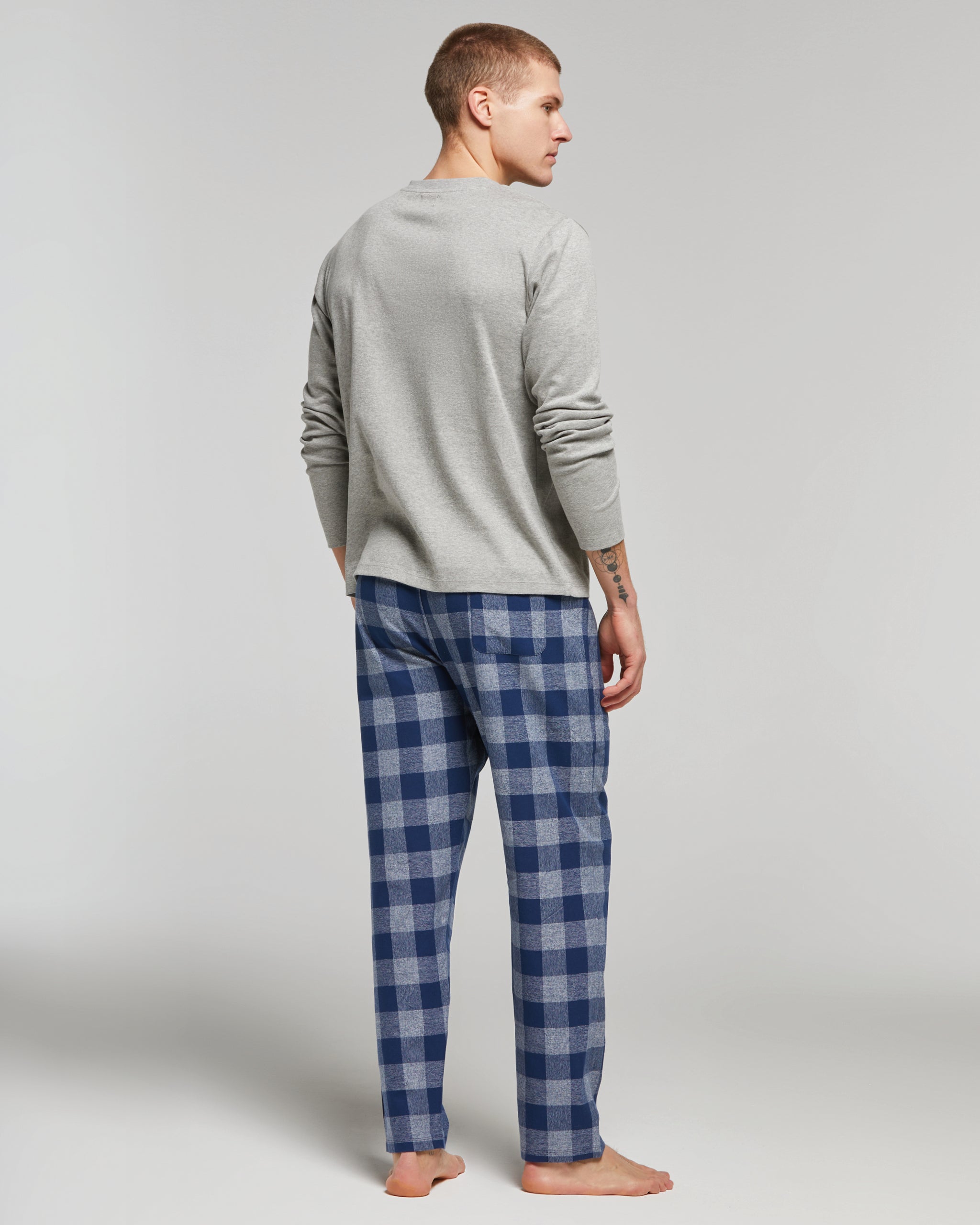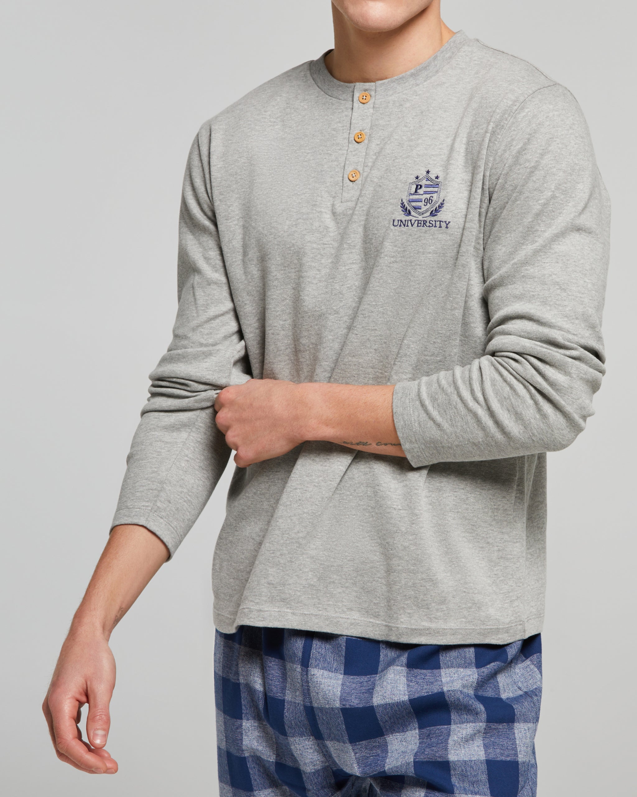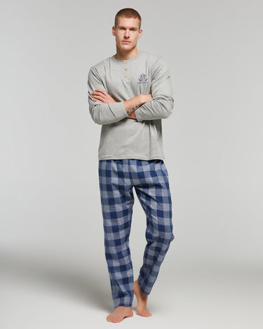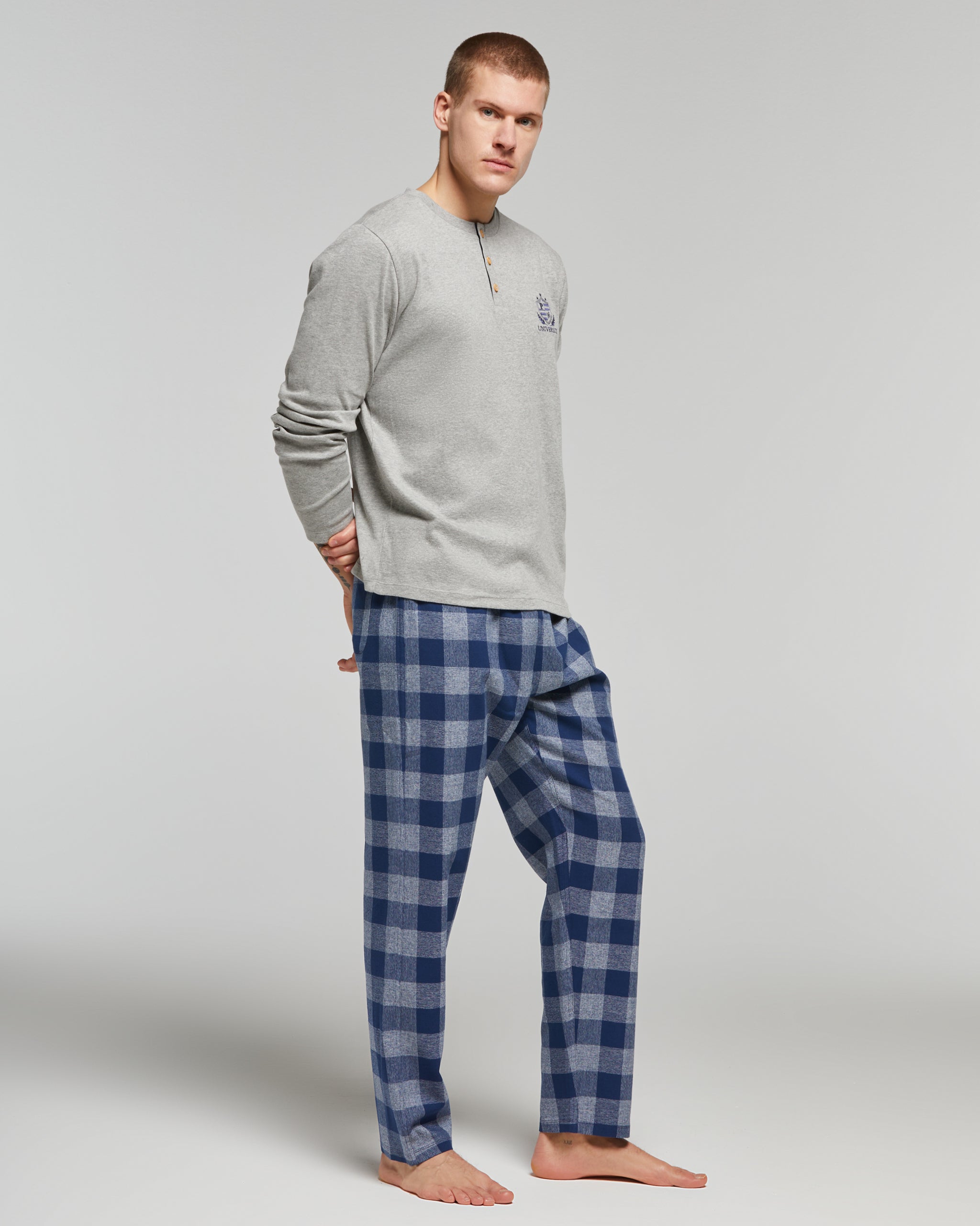 Maglia pigiama uomo in cotone interlock e pantaloni in flanella color grigio mélange. La maglia presenta scollo a serafino e ricamo all'altezza del cuore. Pantaloni in flanella con tasca posteriore.