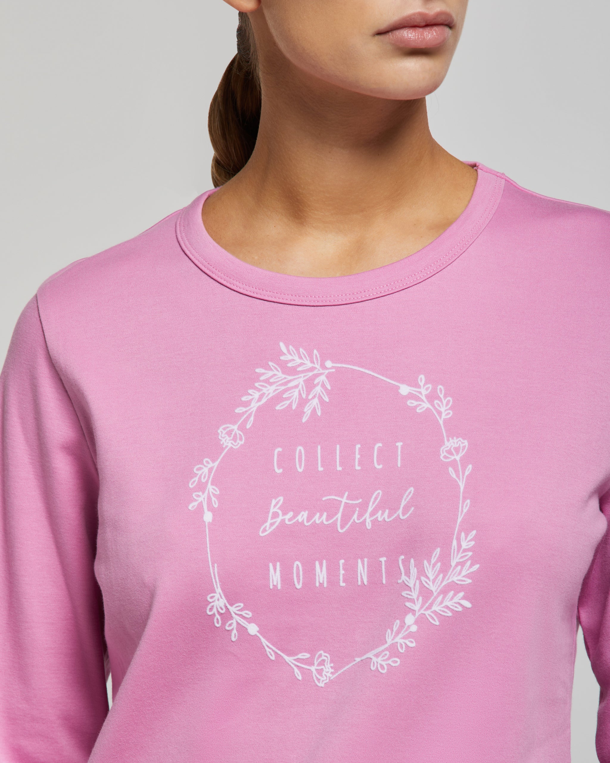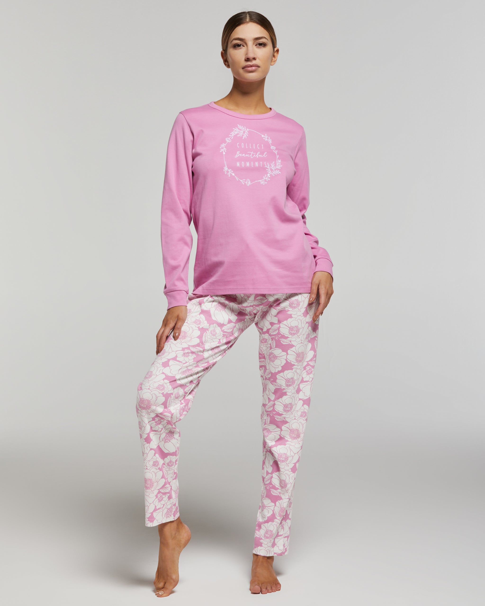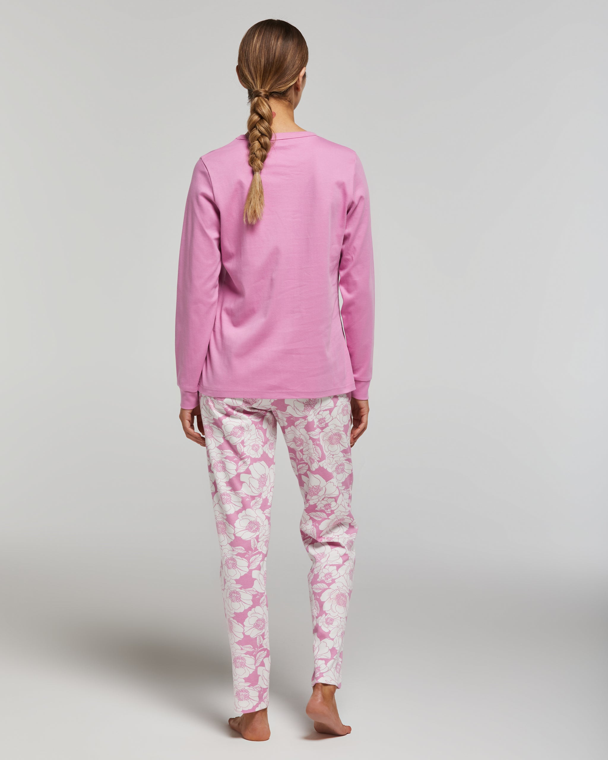 Maglia e pantalone di questo pigiama da donna sono realizzati in caldo cotone interlock. La maglia è in tinta unita rosa con scollo rotondo e stampa effetto floccato. Il pantalone è stampato a motivi floreali con coulisse in satin e tasca sul dietro.