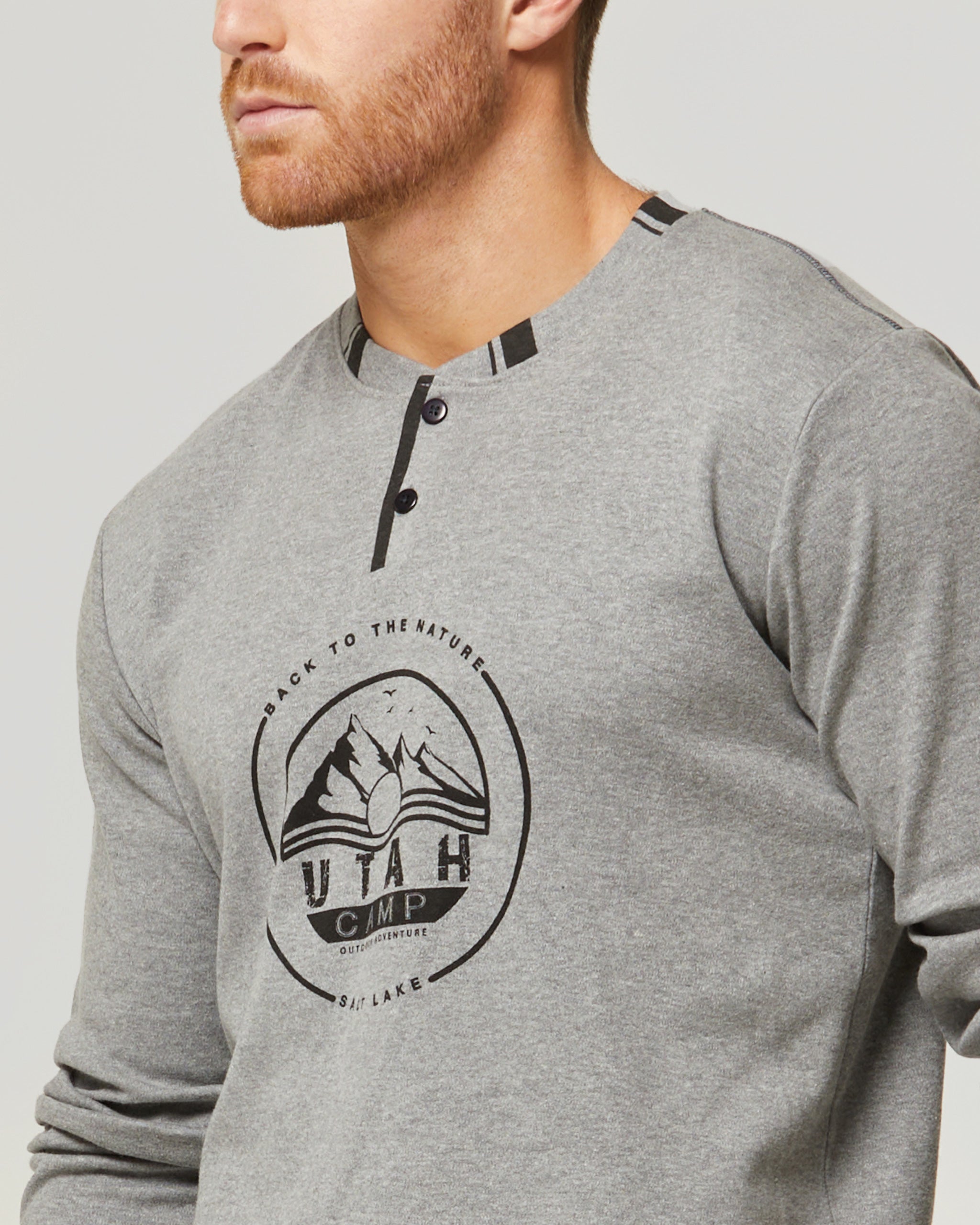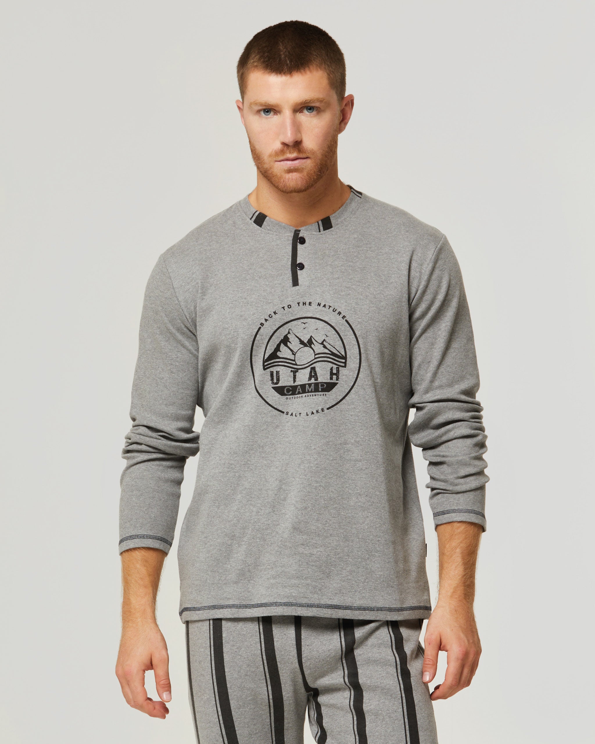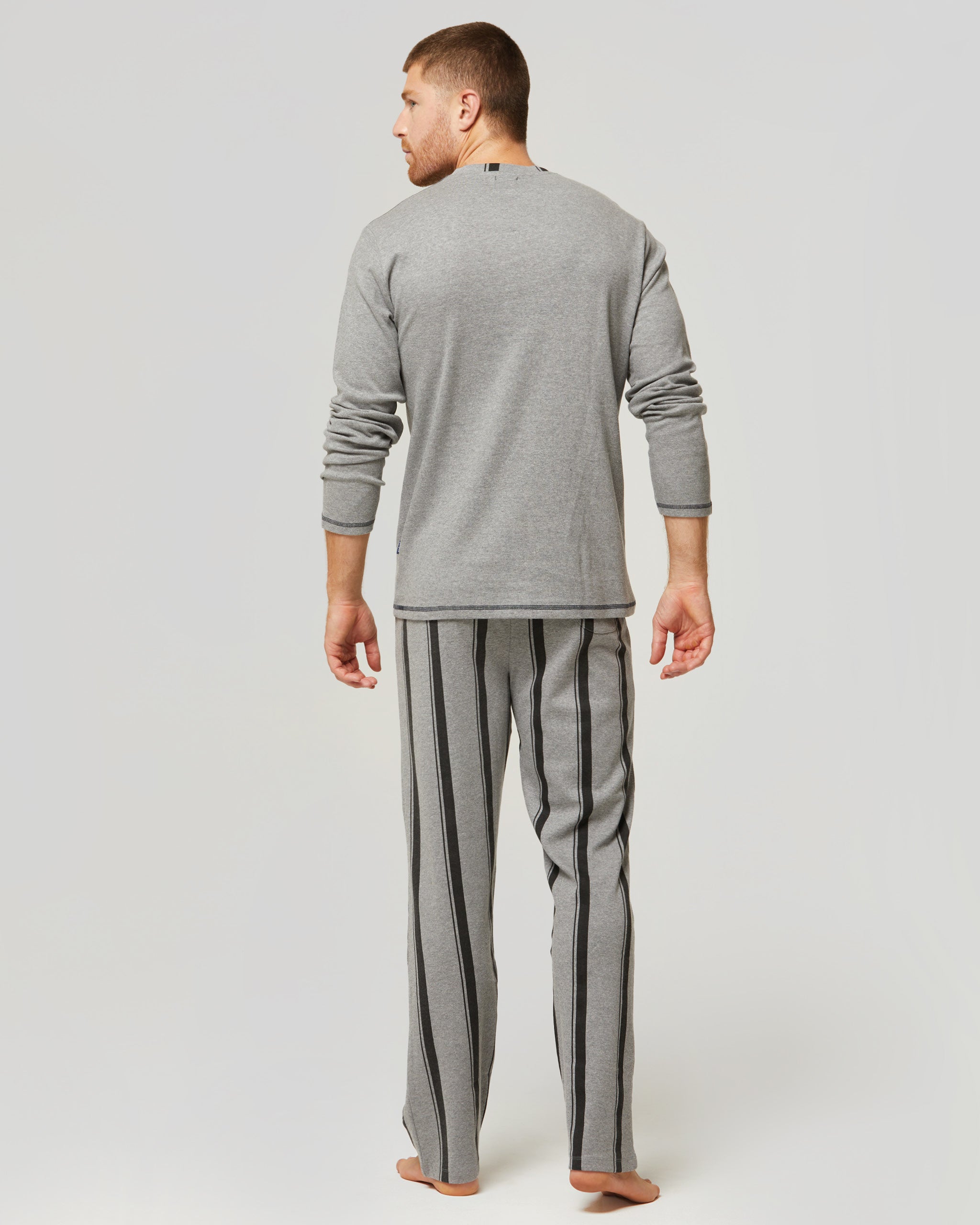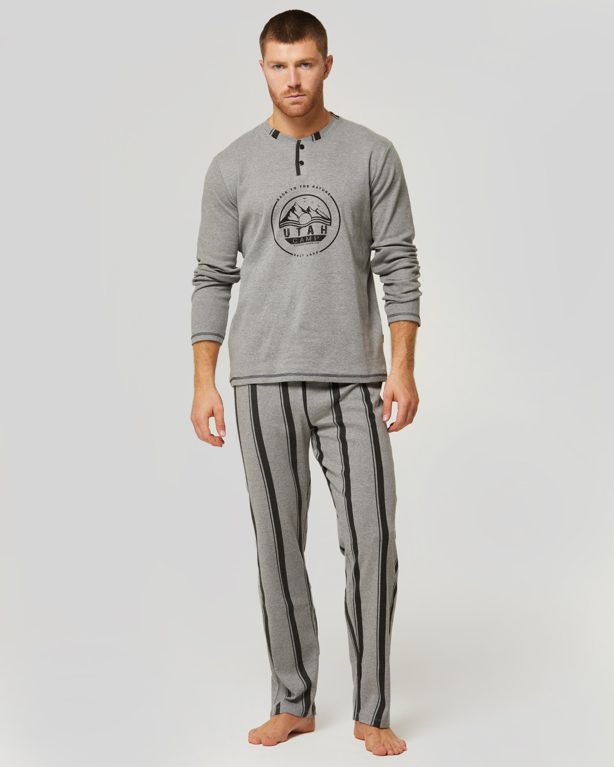 Pigiama uomo in cotone interlock con maglia manica lunga con collo a serafino tinta unita, con stampa e dettagli a contrasto; pantalone lungo con fantasia gessata, con coulisse e taschino posteriore .