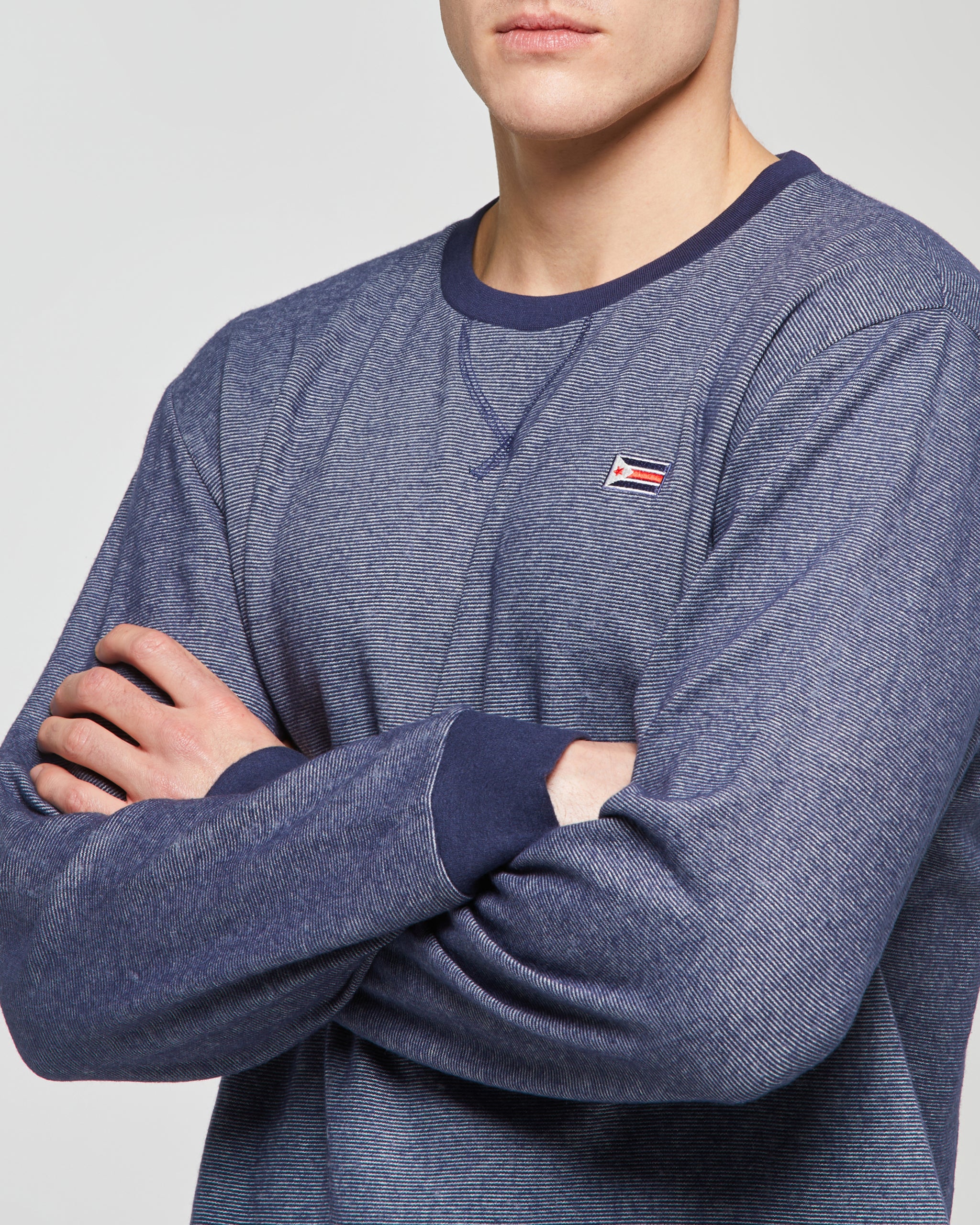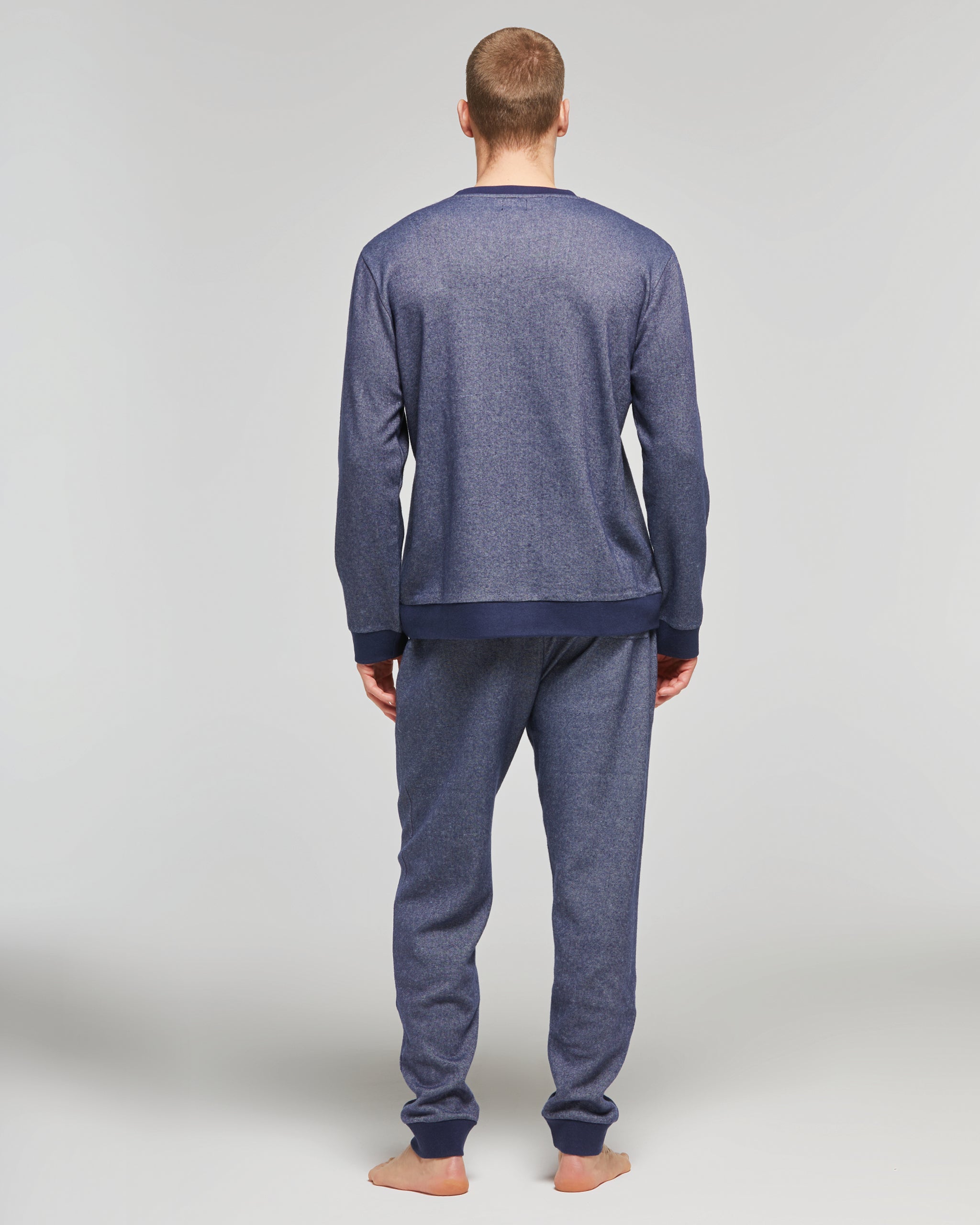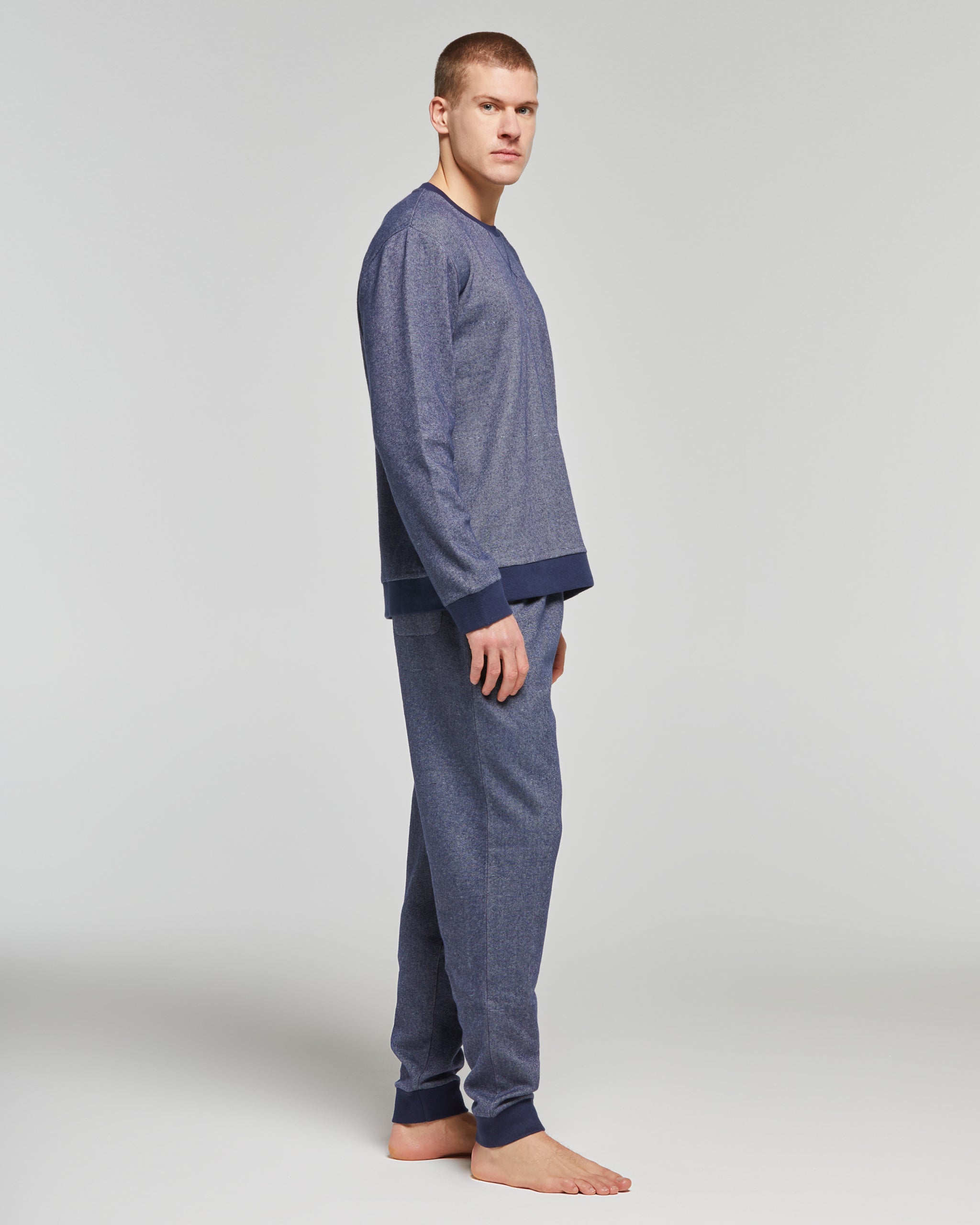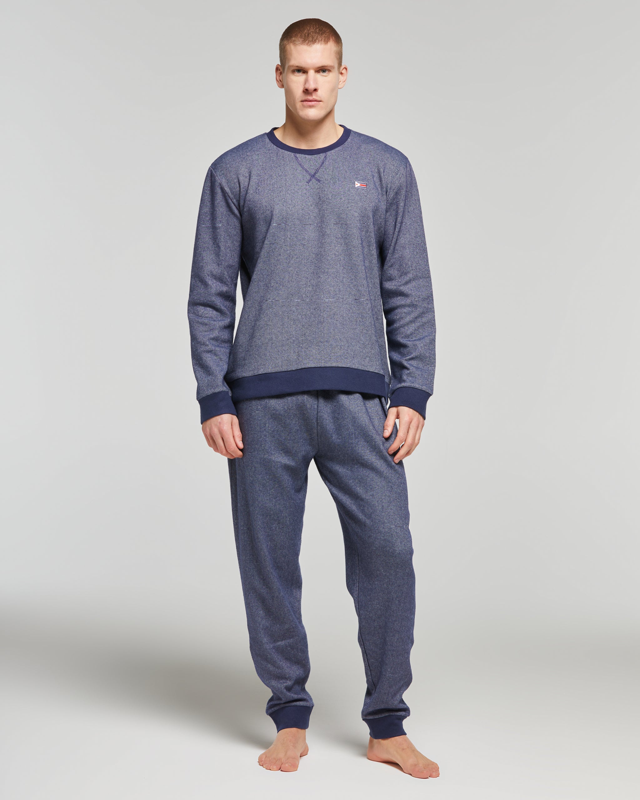 Maglia e pantalone pigiama da uomo in cotone/poliestere con mano morbida. La maglia ed il pantalone sono in fantasia millerighe con scollo rotondo e polsi in tinta unita. Piccolo scudetto ricamato sulla maglia ad altezza cuore.