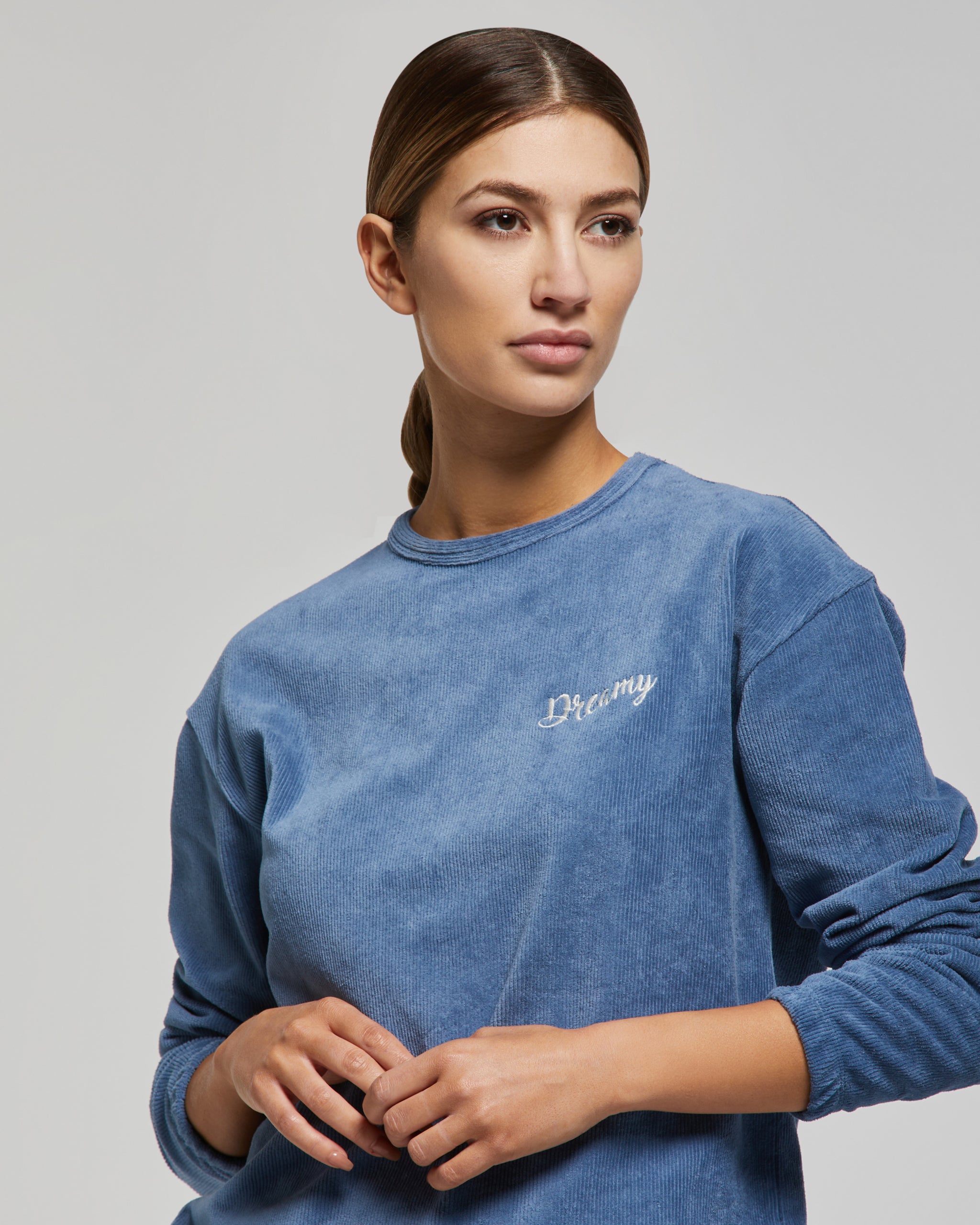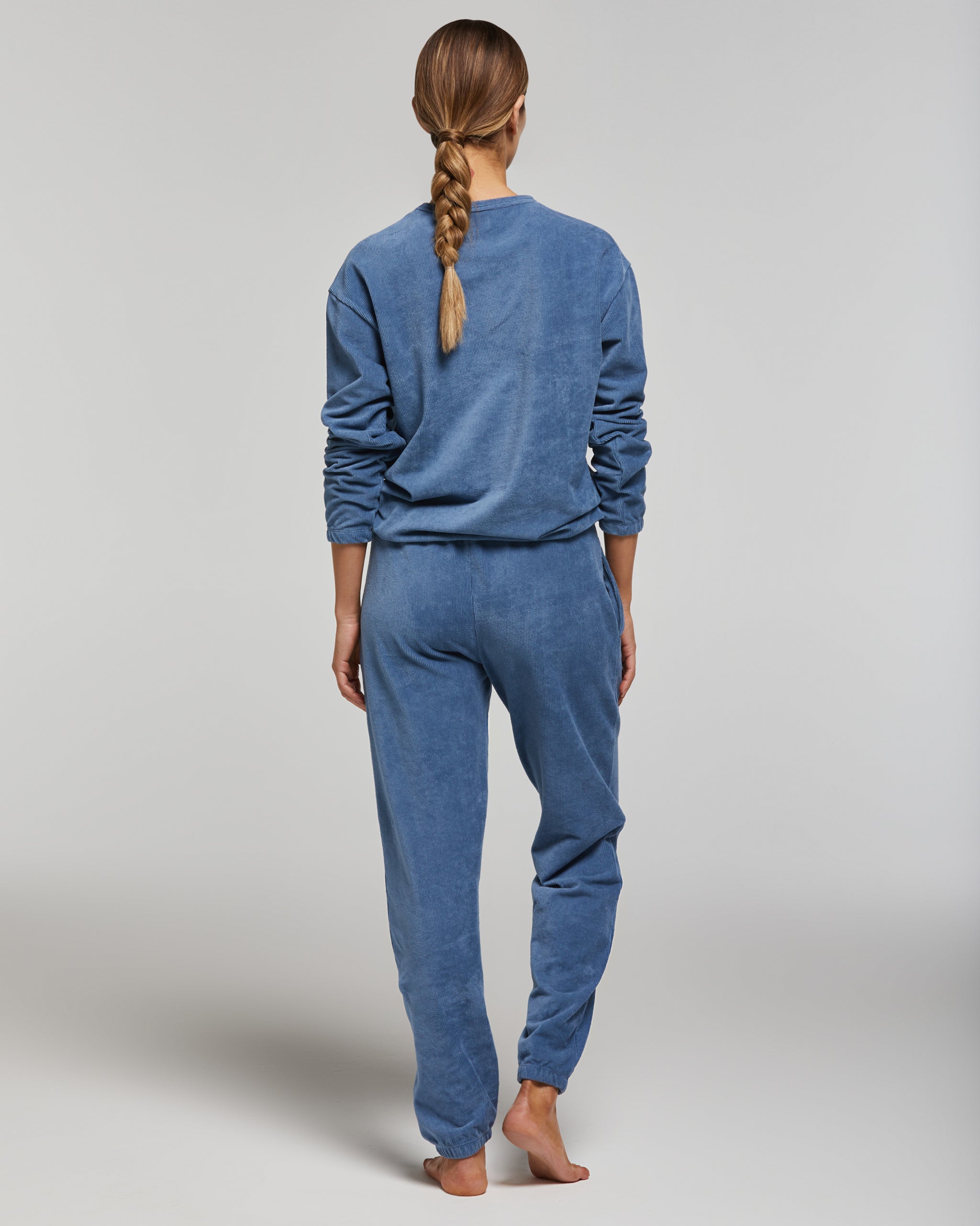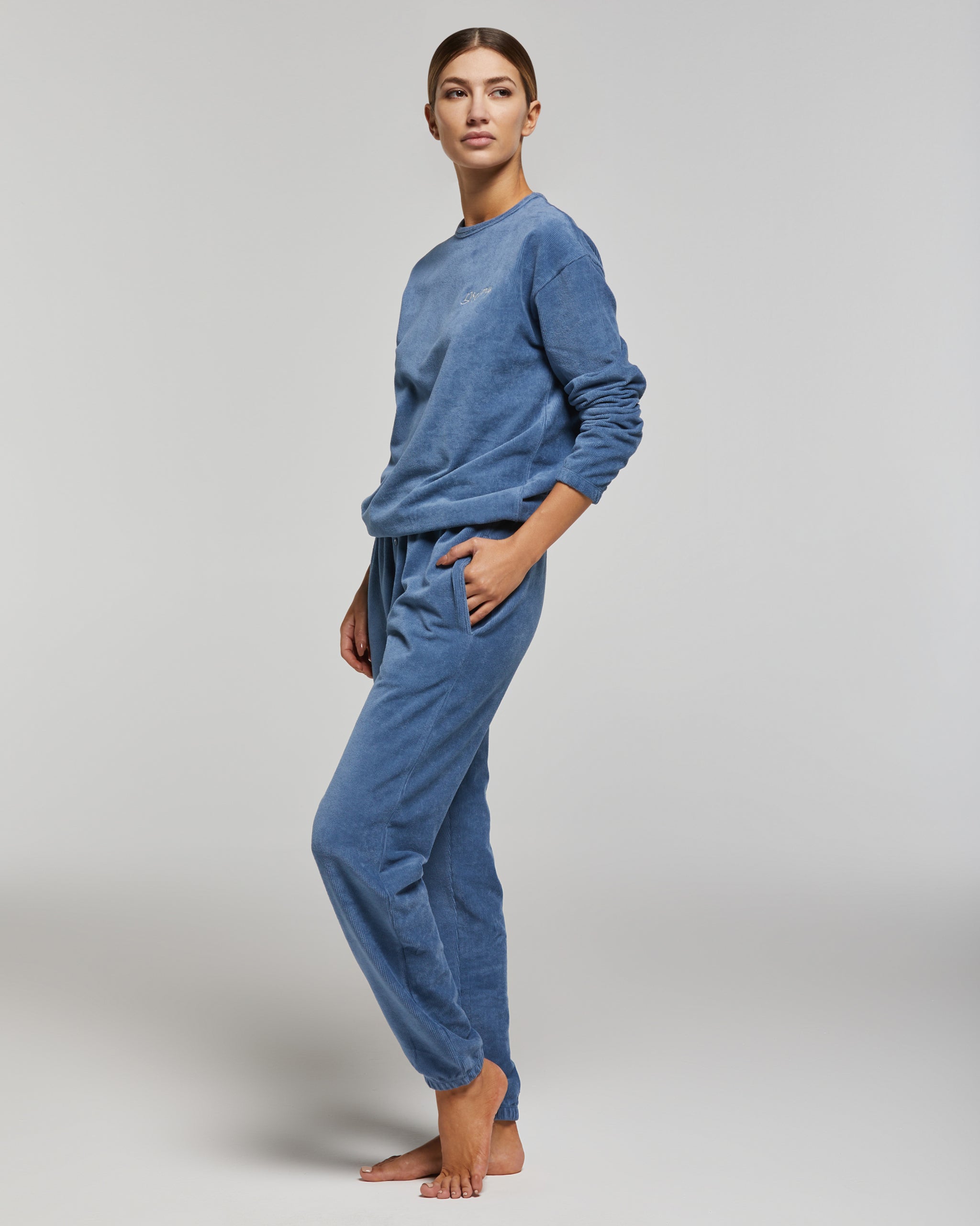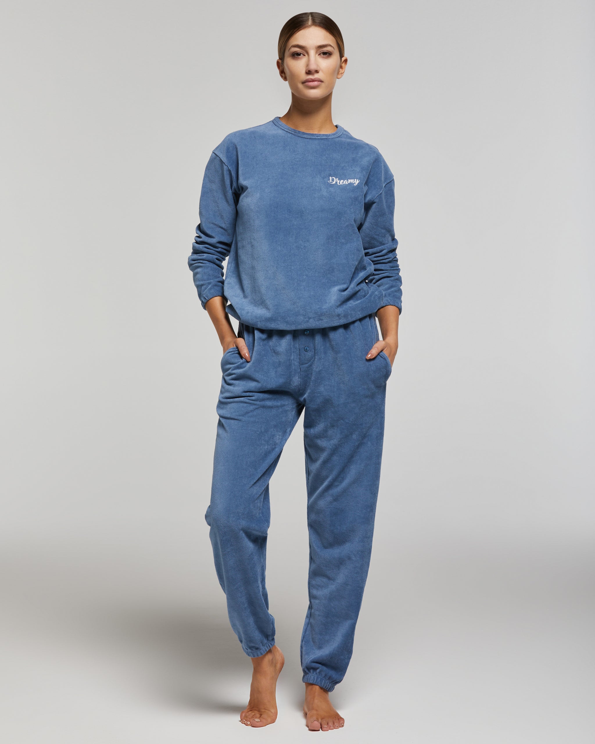 Pigiama lungo in cotone millerighe di velluto in tinta unita da donna. La maglia presenta uno scollo rotondo e un piccolo ricamo all'altezza del cuore. I pantaloni sono dotati di tasche laterali e di una finta patta abbellita da 3 bottoni.