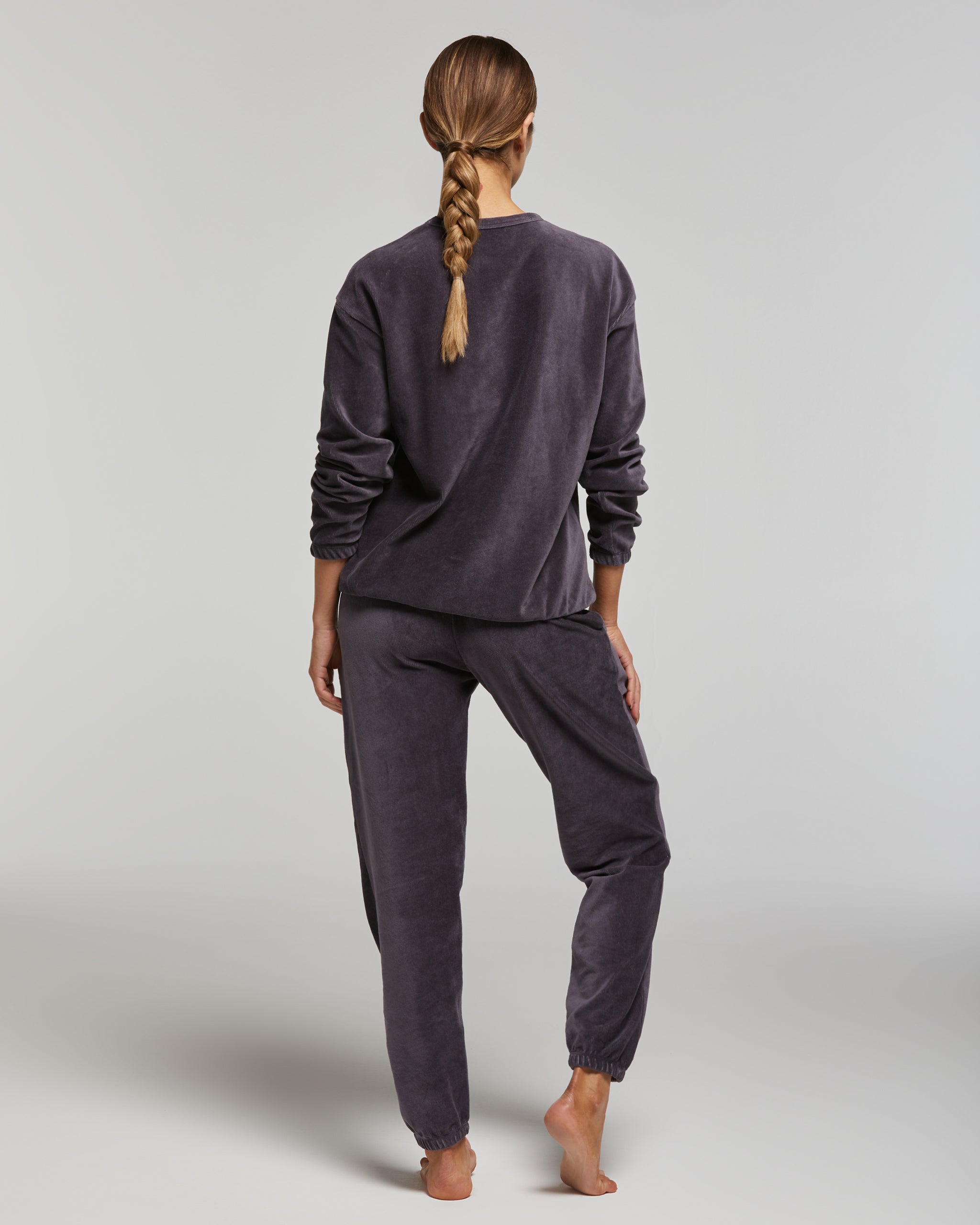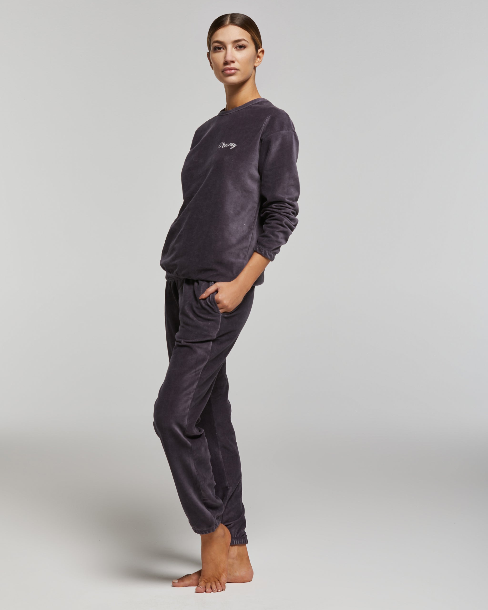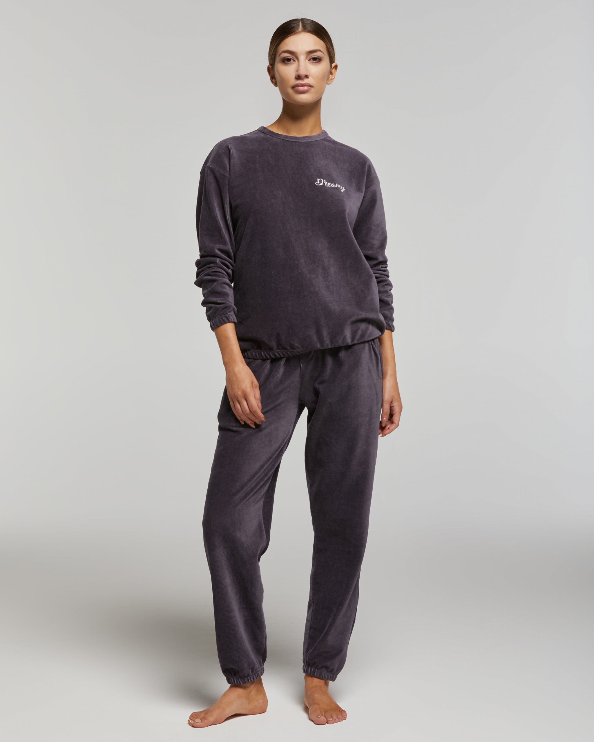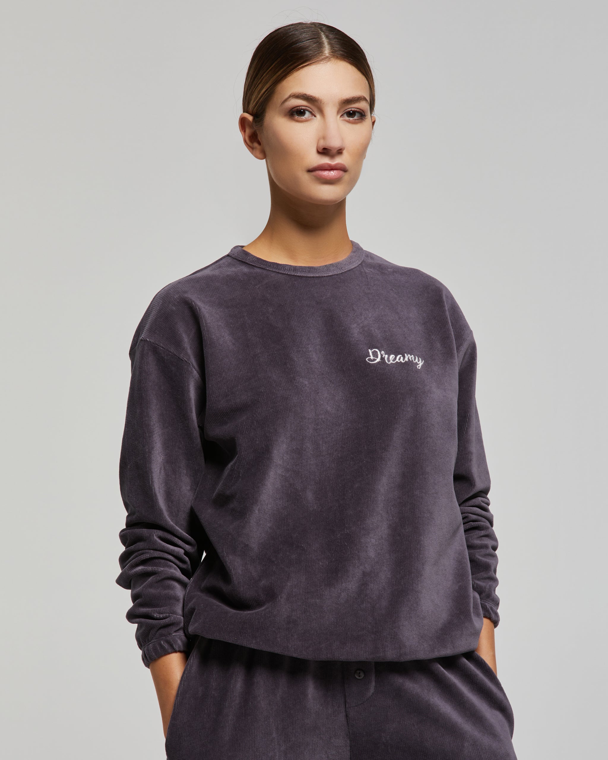 Pigiama donna in velluto millerighe di cotone in tinta unita grigio scuro. La maglia ha scollo rotondo e un piccolo ricamo ad altezza cuore. Il pantalone ha tasche laterali e finta patta impreziosita da 3 bottoni.